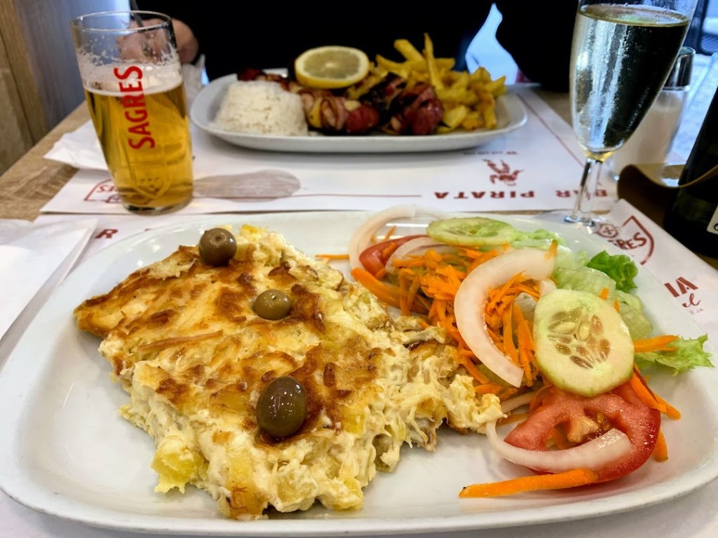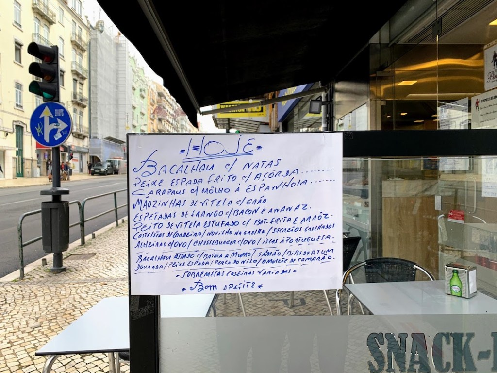Hand writing daily specials (Prato do dia) are usually a good sign for local traditional freshly cooked Portuguese food.He goes with a draft (imperial in Portuguese) and I took a glass of “sparkling wine” (vinho a pressão)My lunch: Bacalhau com natas, a popular salted cod dishHis: Espetadas de frango, skewered grilled chicken with bacon, sausage, pineapple Dessert (sobremesa): Rice budding (arroz doce), Portuguese egg tart (pastel de nata)