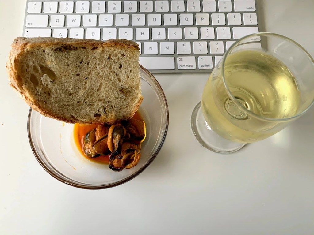 Snack: Canned mussels, olive bread + white wine @ 10:20 a.m.