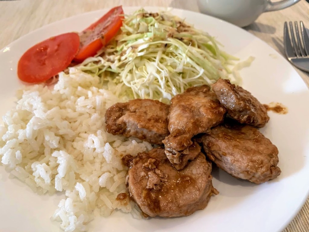 Lunch: Ginger pork, cabbage, tomato, rice @ 12:40 p.m.