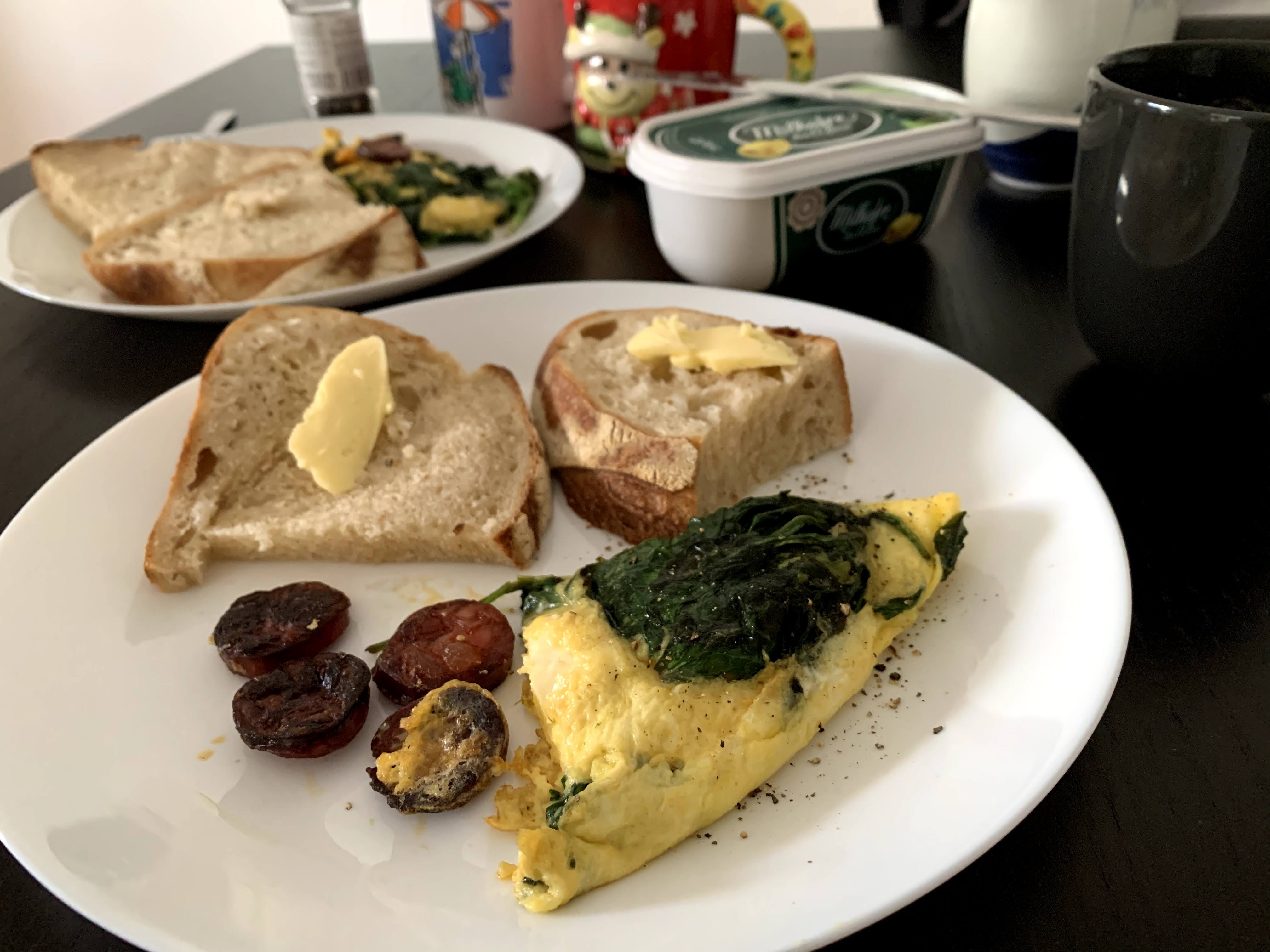 Second breakfast: Spinach omelette, chouriço, bread with butter, coffee @ 10:00 a.m.