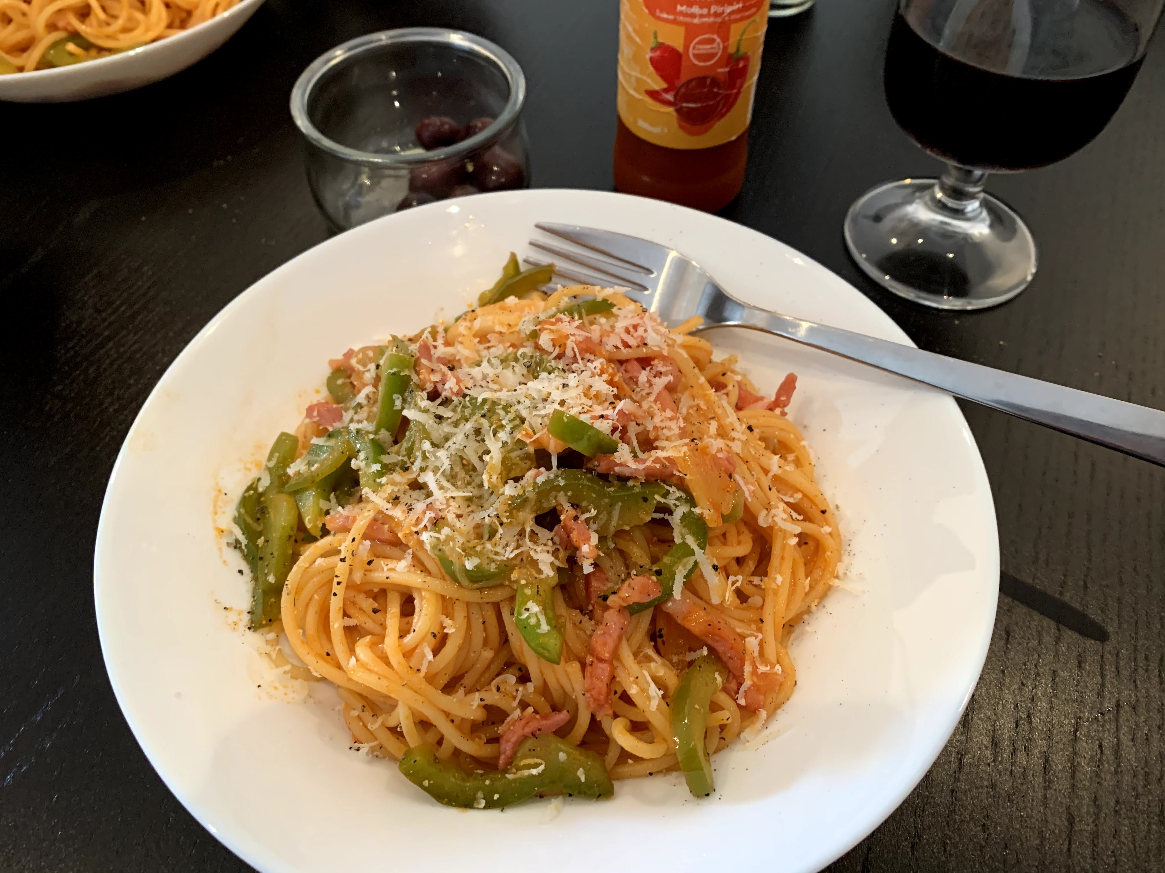 Lunch: Spaghetti Napolitan, olives, red wine @ 2:00 p.m.