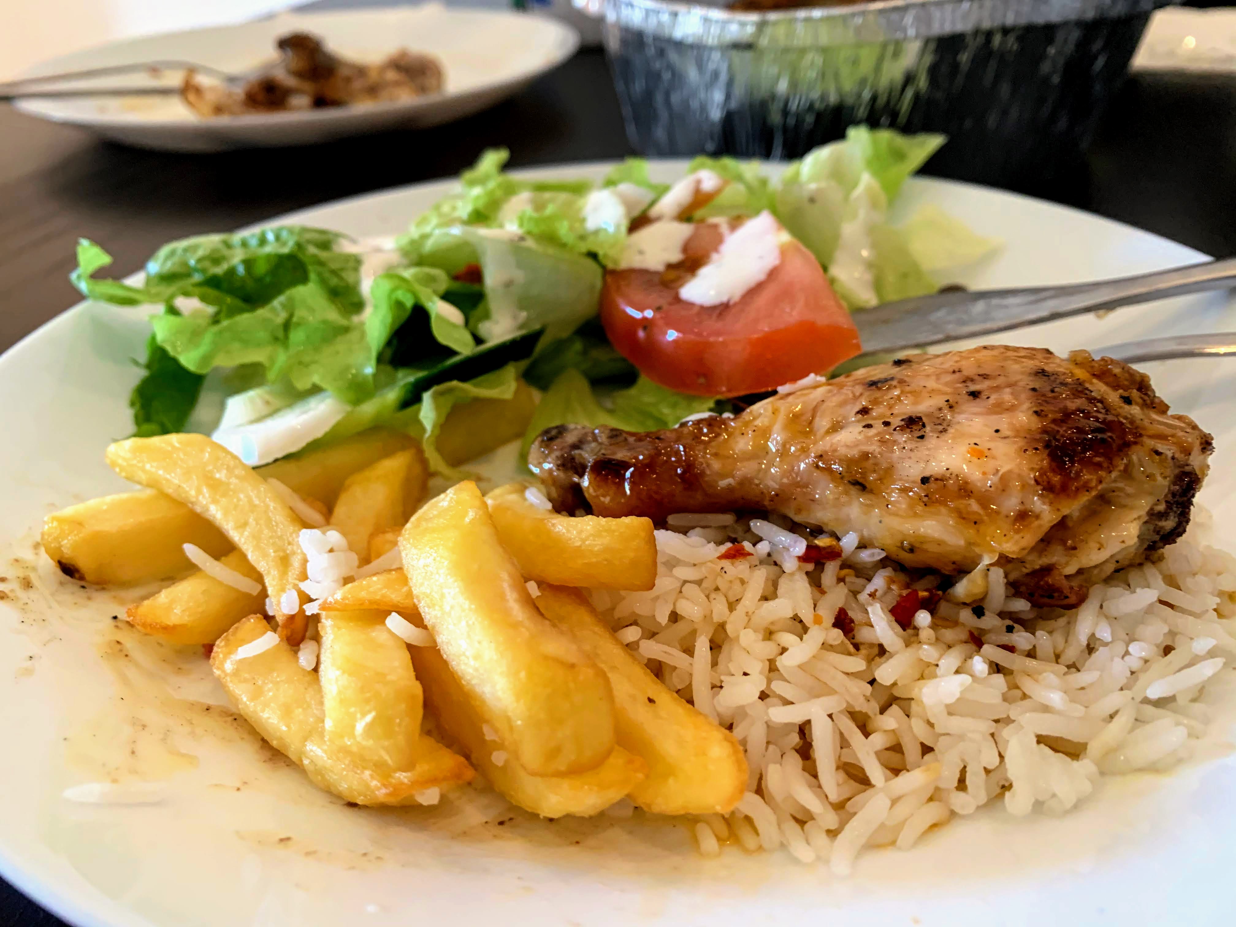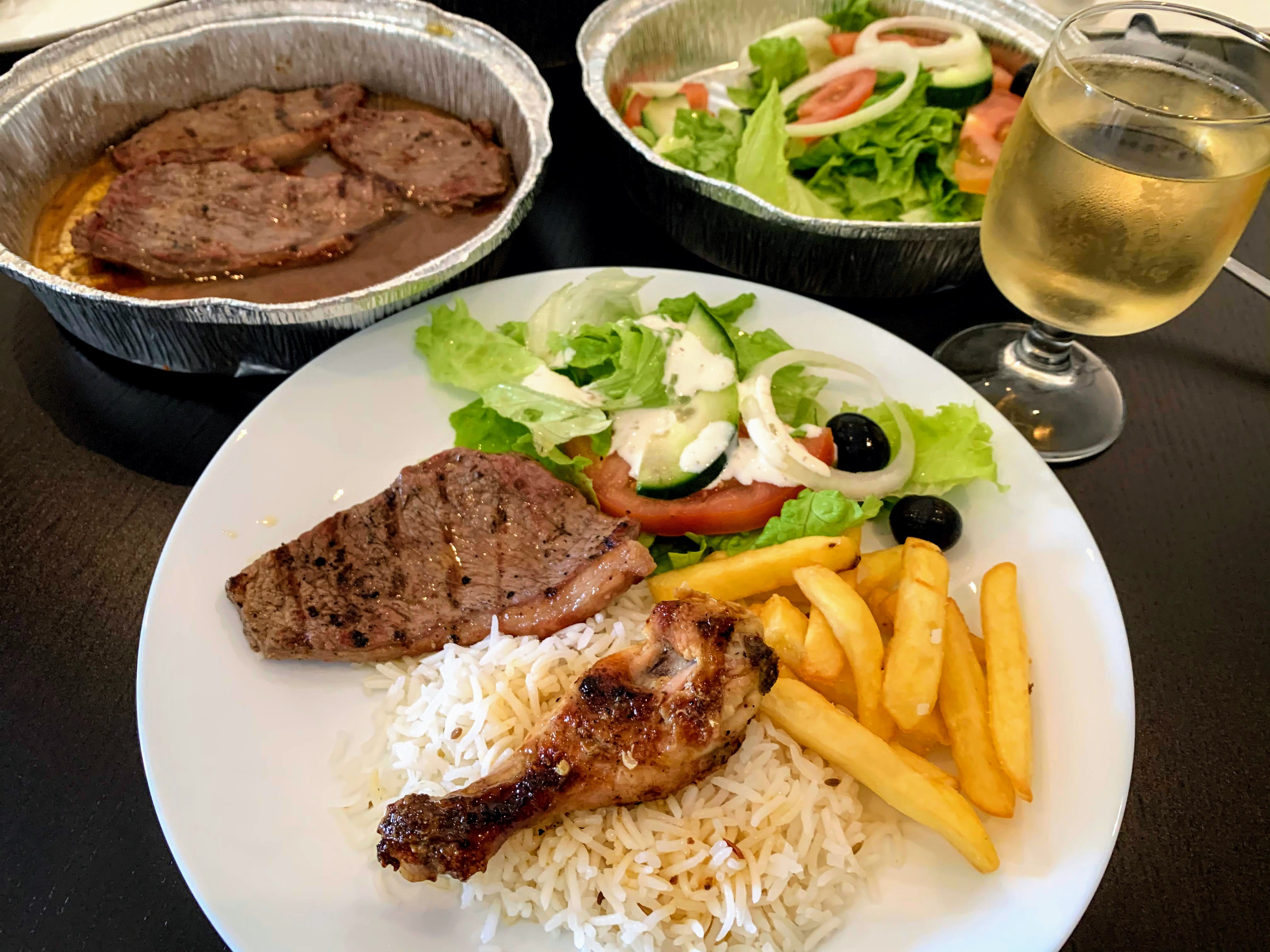 A whole char-grilled chicken with rice & fries (10€), Picanha (6.50€), Small salad (2€) @ 12:10 p.m.