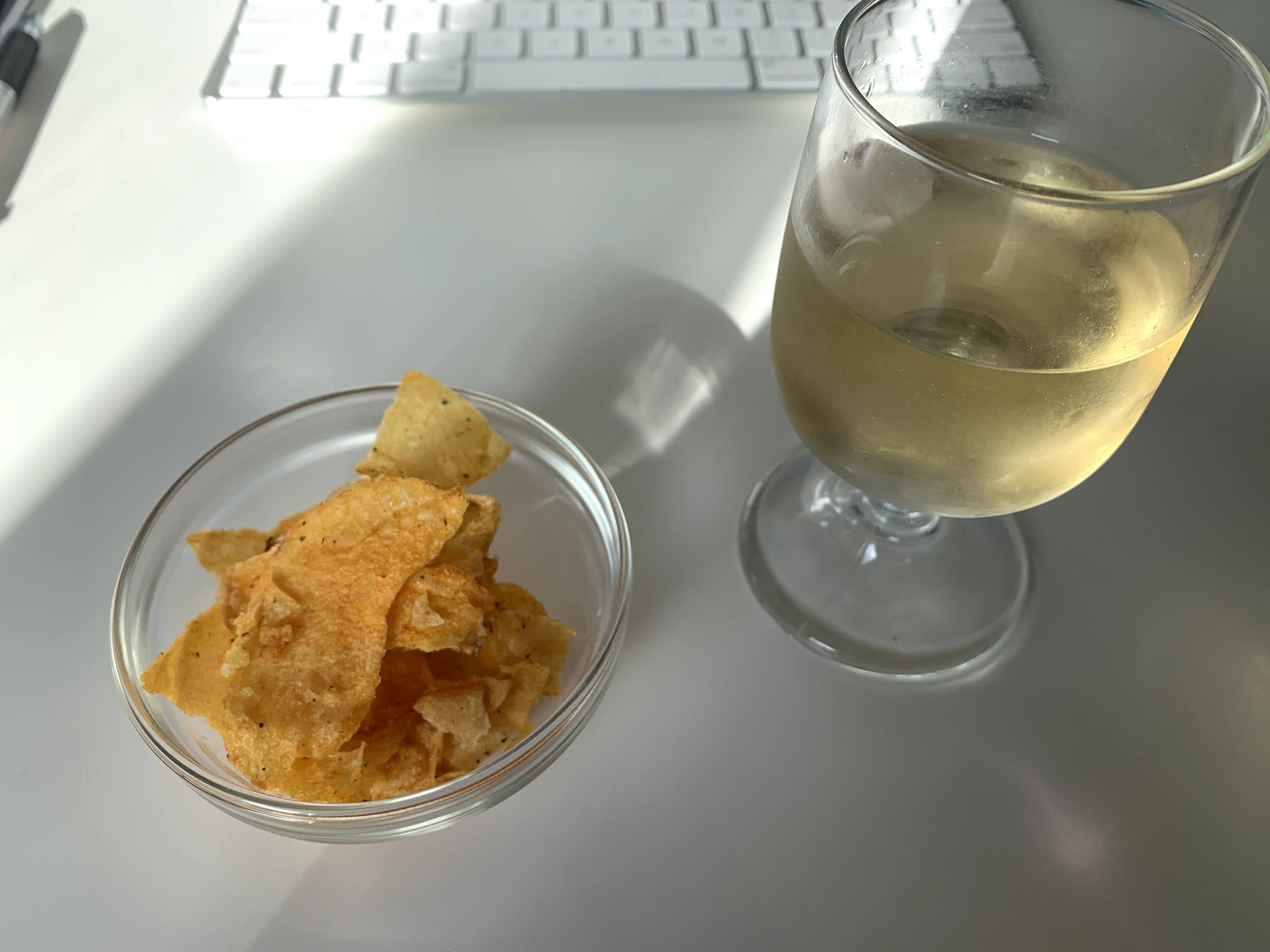 Truffles as dessert and another glass of wine with chips