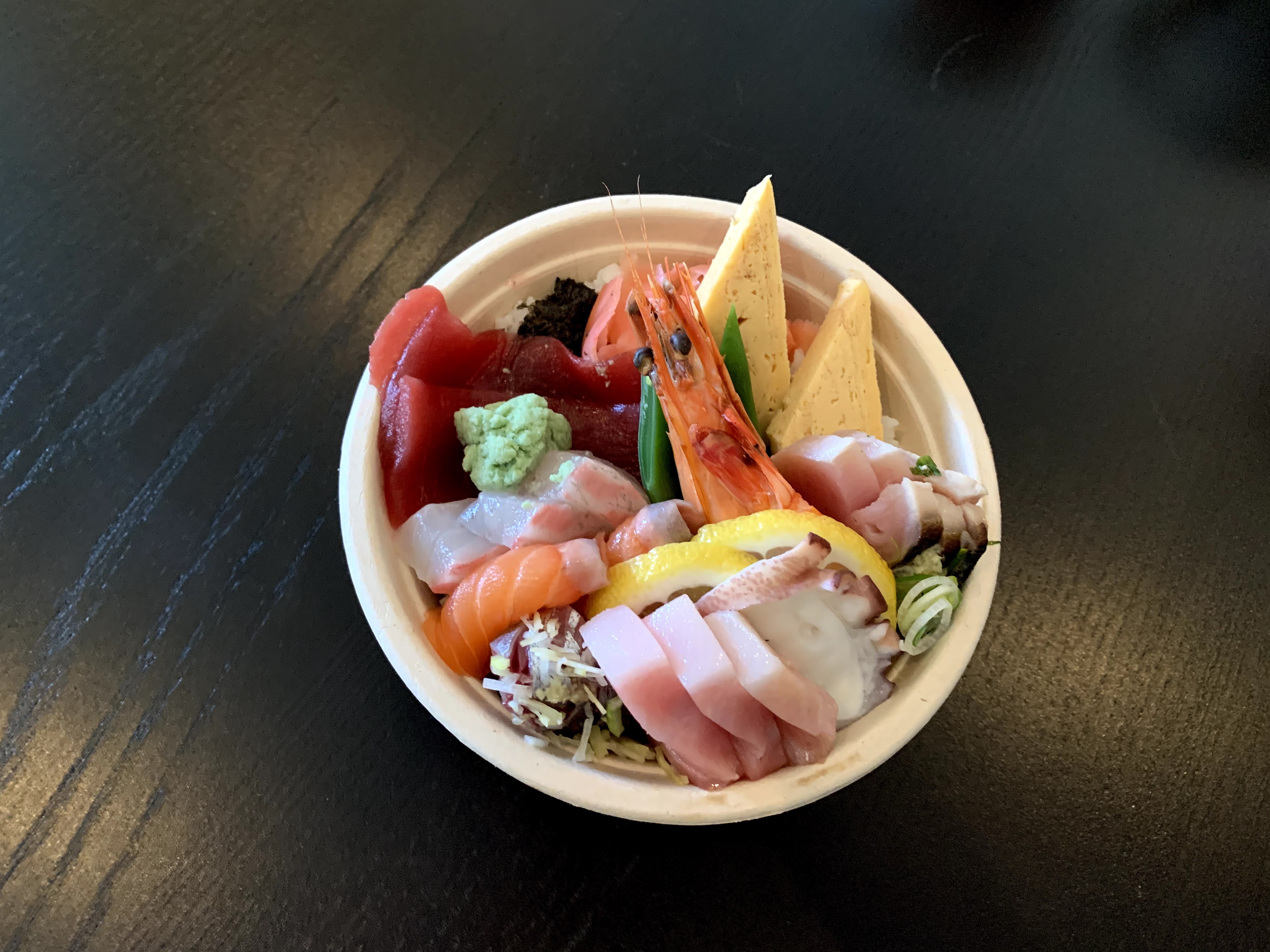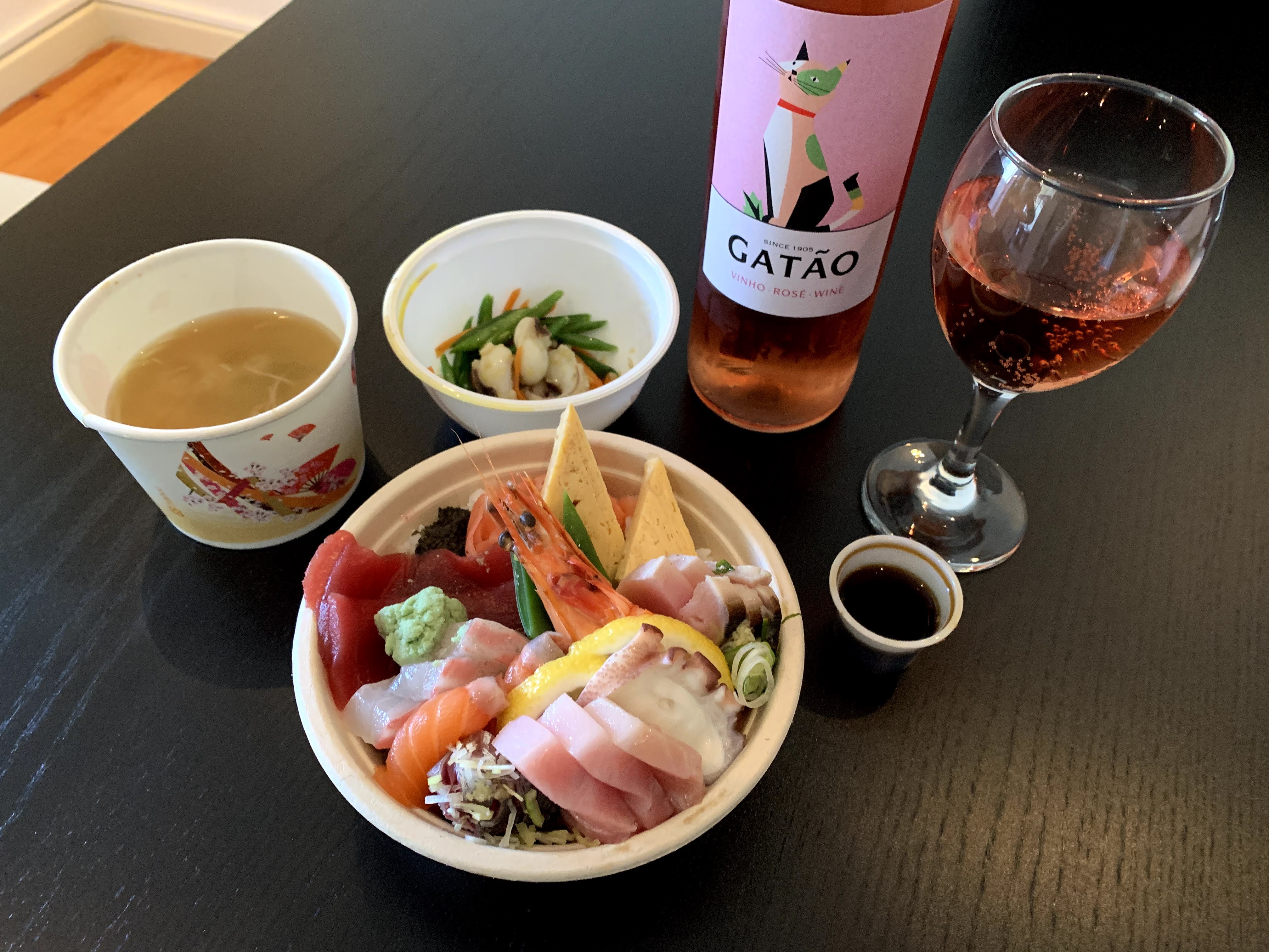 Chirashi lunch including miso soup & salad from Aron Sushi (16.50€) + Portuguese rose wine