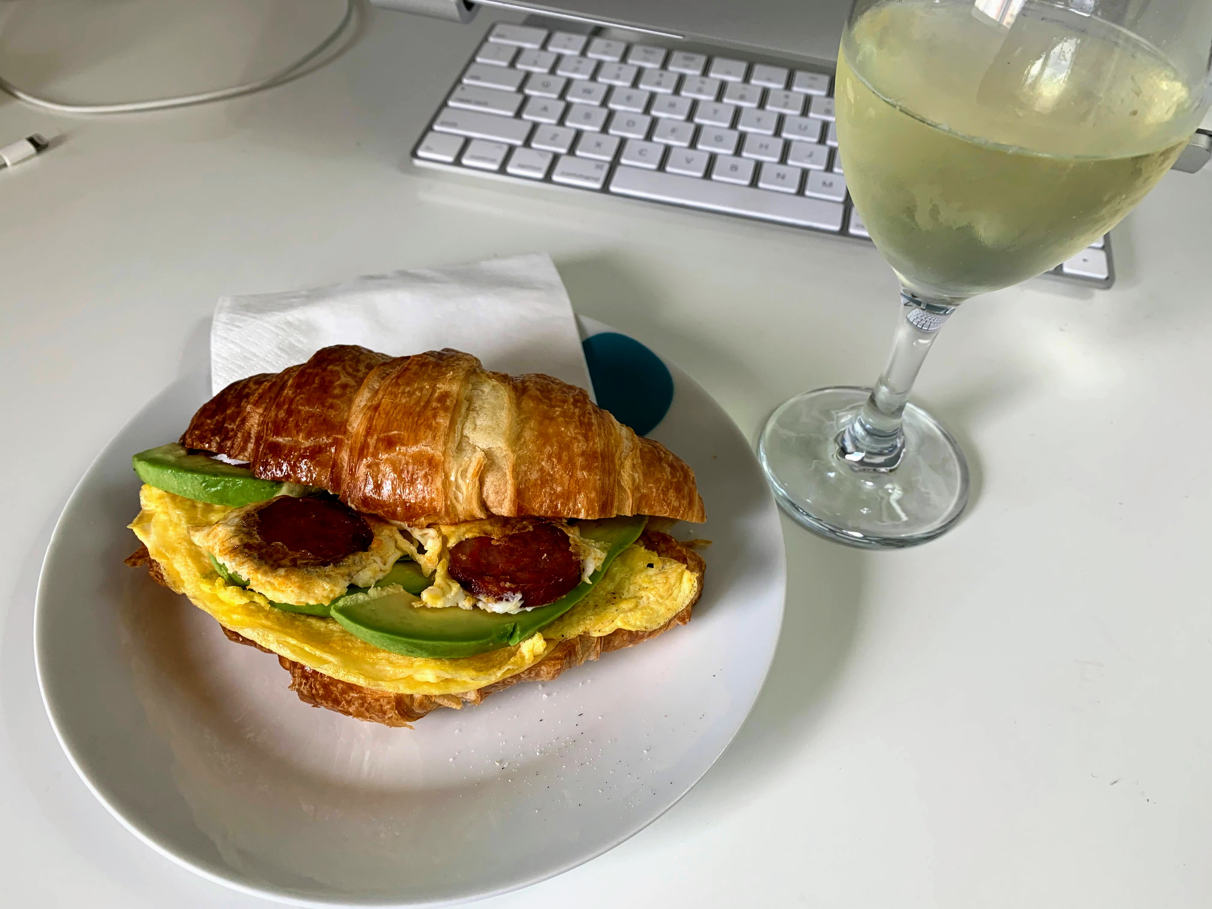 Brunch: Croissant Francês with egg, chouriço, avocado + vinho verde @ 11:00 a.m.