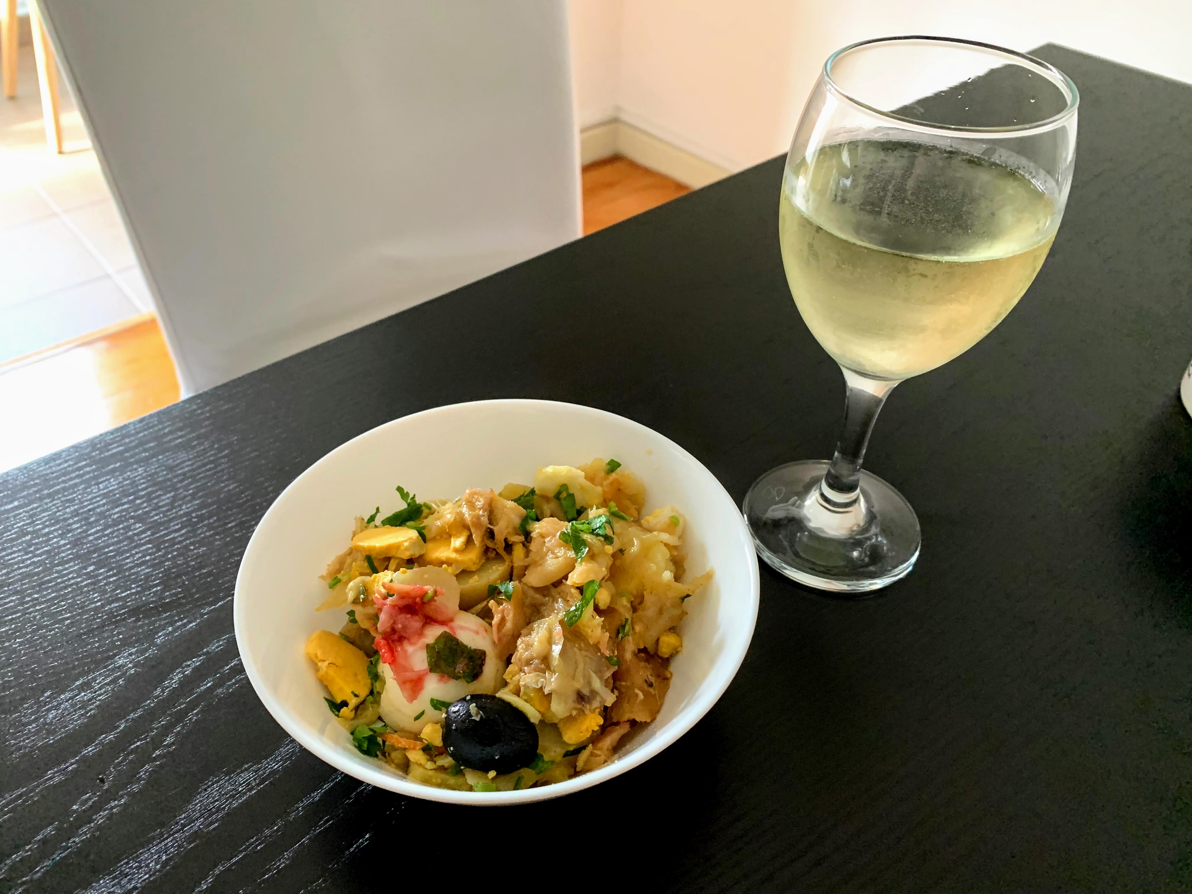 Lunch: Leftover Bacalhau à Gomes de Sá + vinho verde @ 2:40 p.m., I made pasta for him and he had lunch earlier.