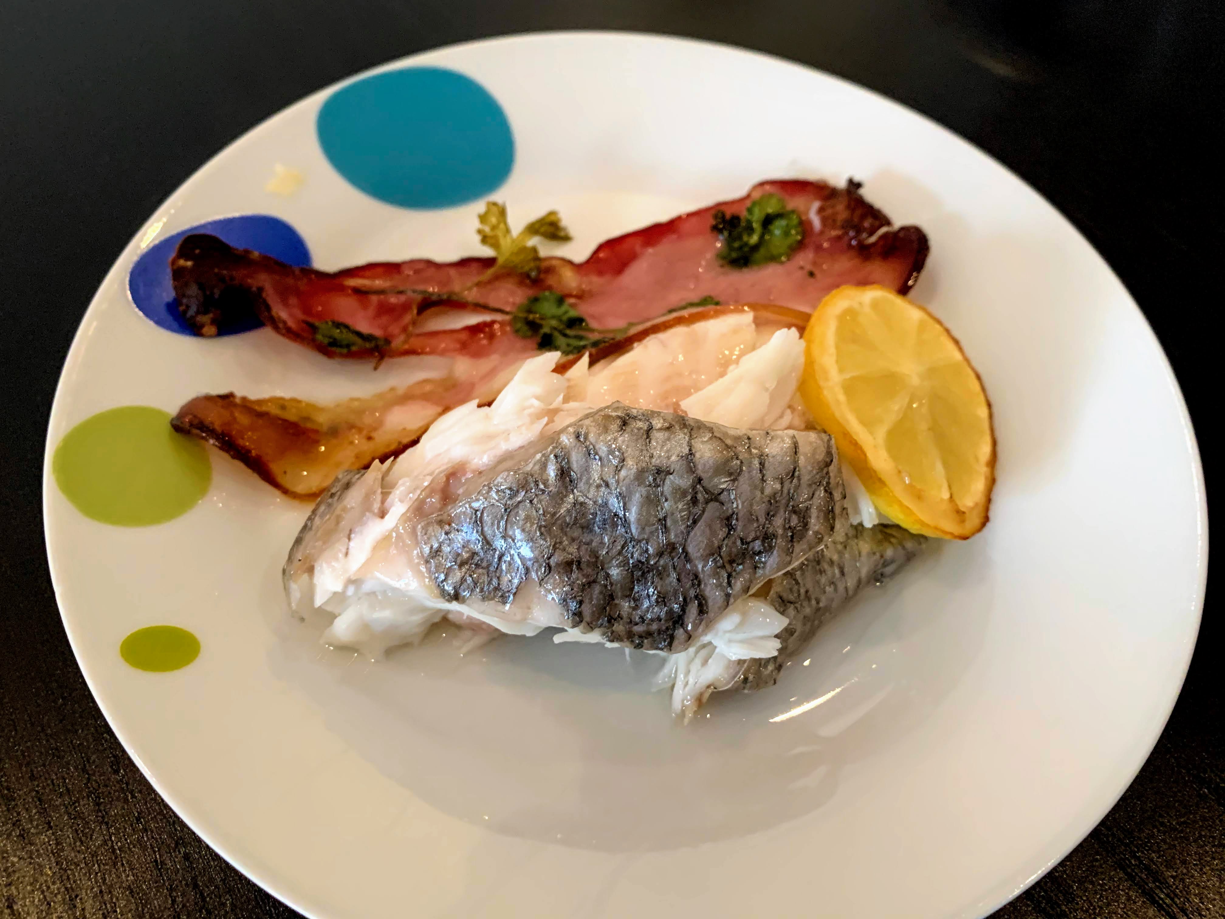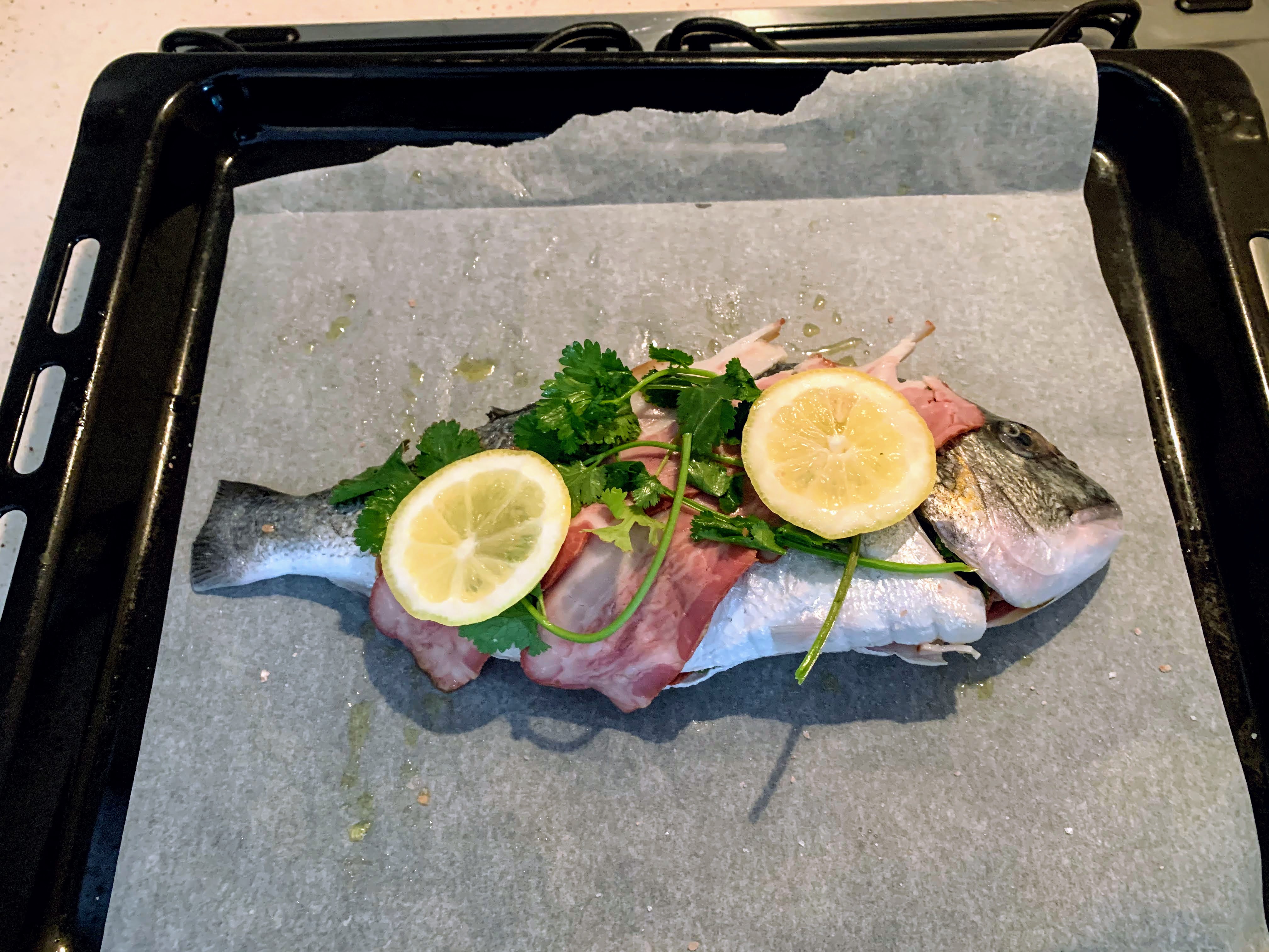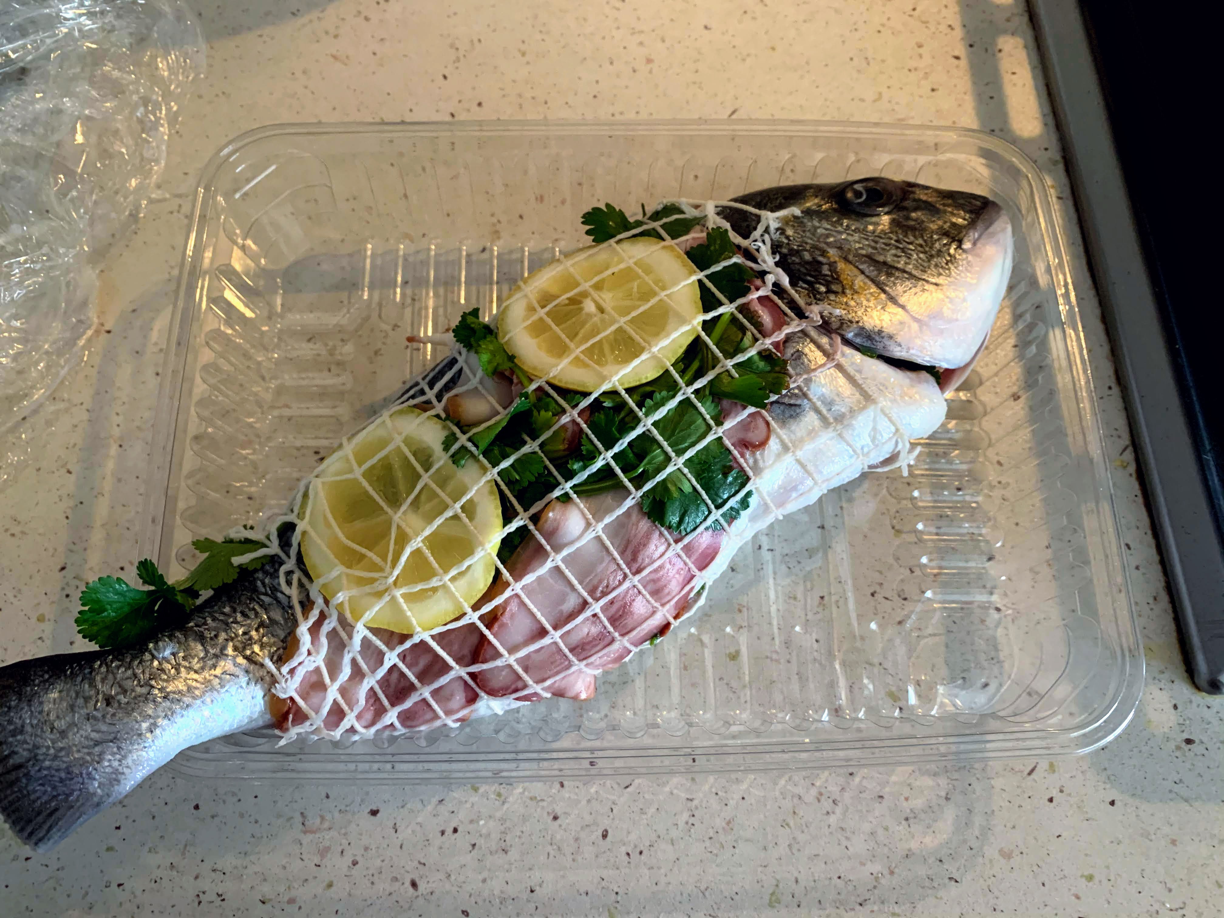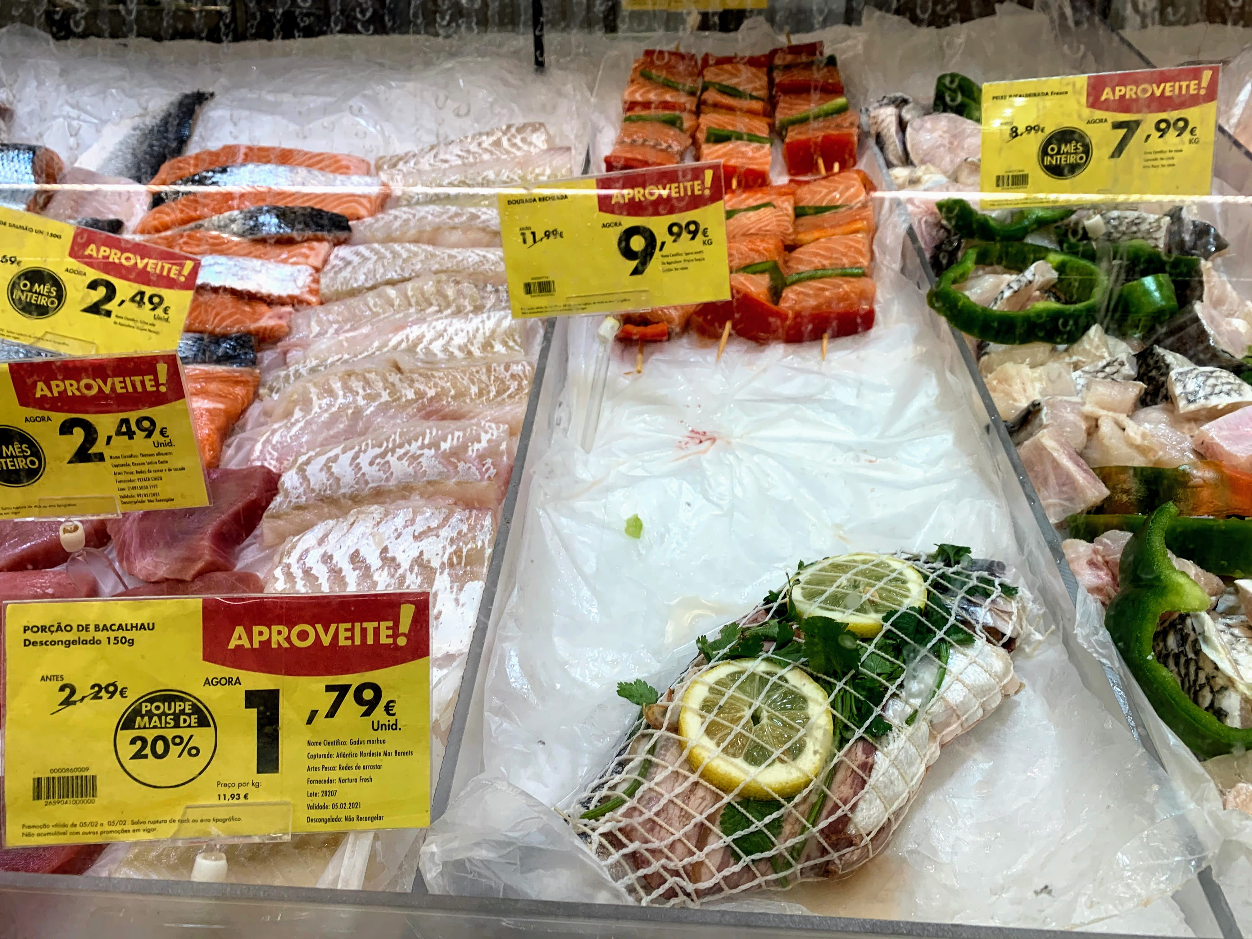 I went to a supermarket. When I was thinking what fish to buy in front of seafood section, a store attendant greeted, “Olá bom dia!” I said, “Não sei qual eu queria comprar. (I don’t know what I want.)” Then she recommend this stuffed fish and said, “É muito bom! (It’s very good!)” First I was not sure, but why not! I could try and trust. She said something like “Add salt & pepper, then put in the oven and enjoy with wine wine.” It was all Portuguese, so I understood “mais ou menos (more or less/so so).”