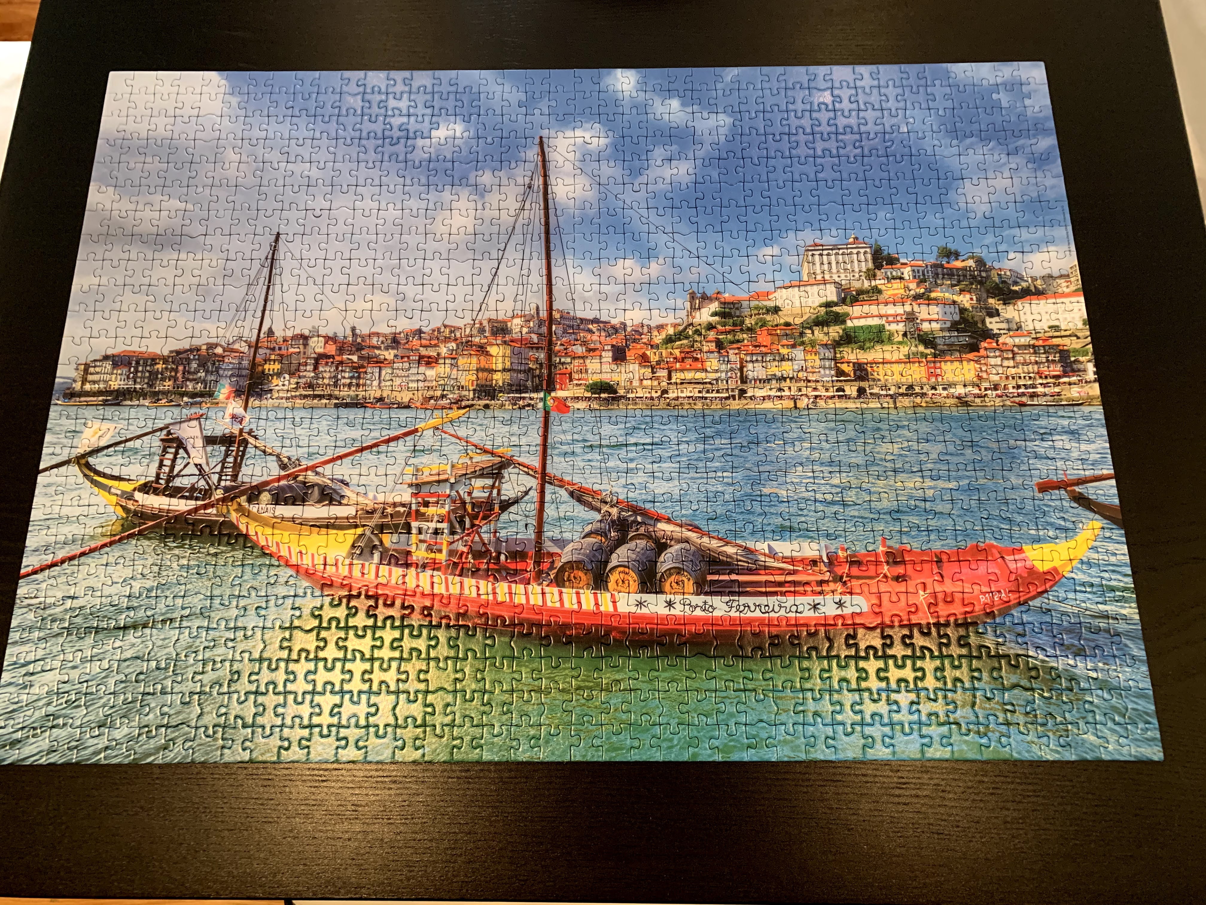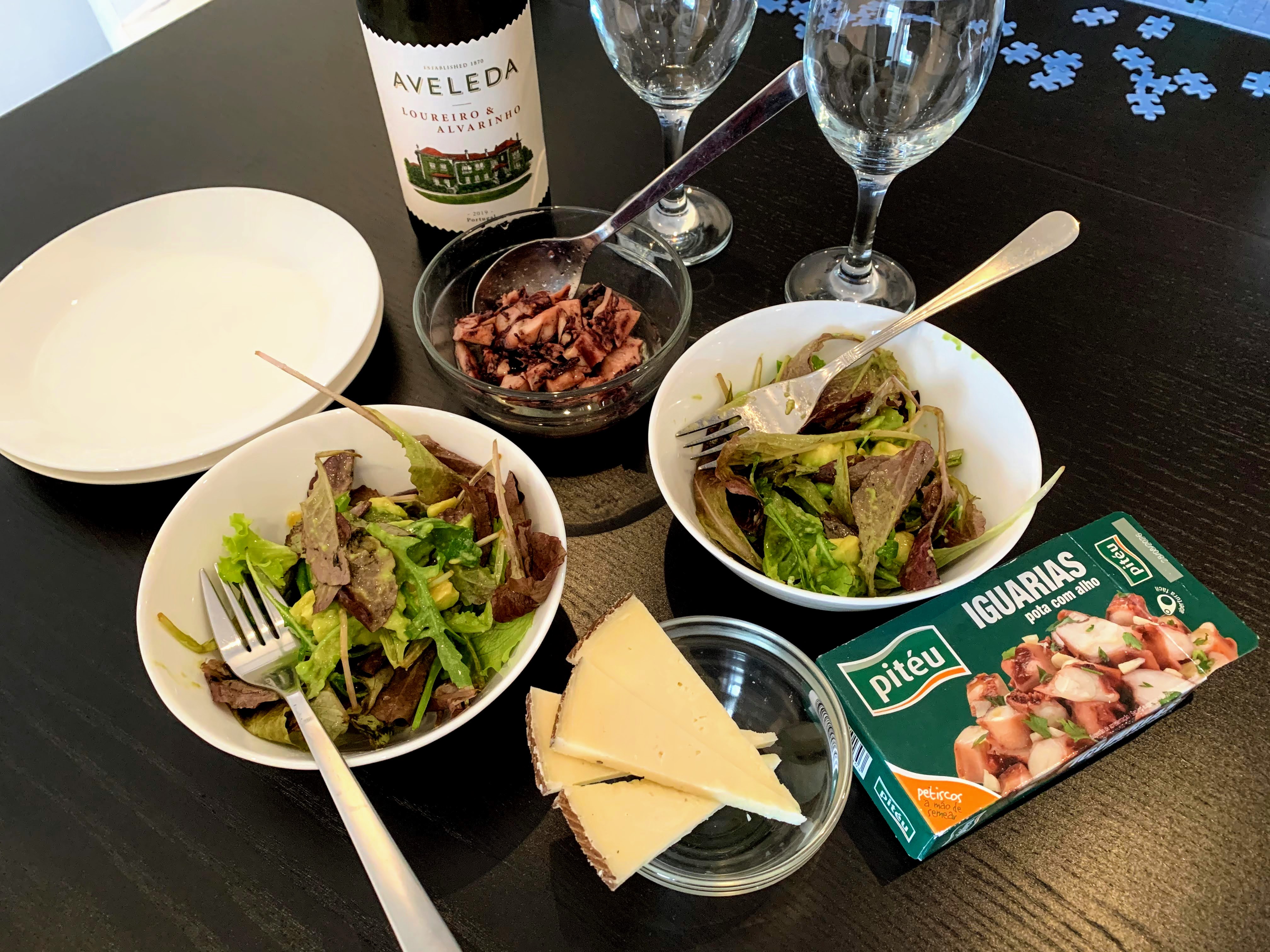 It was actually a good idea to buy a ready-to-cook fish. Easy and quick! Roasted in the oven for 25 minutes.Appetizer: Avocado salad, Spanish cheese, canned octopus, vinho verde @ 12:50 p.m. We ate and drank while enjoying the jigsaw puzzle.
