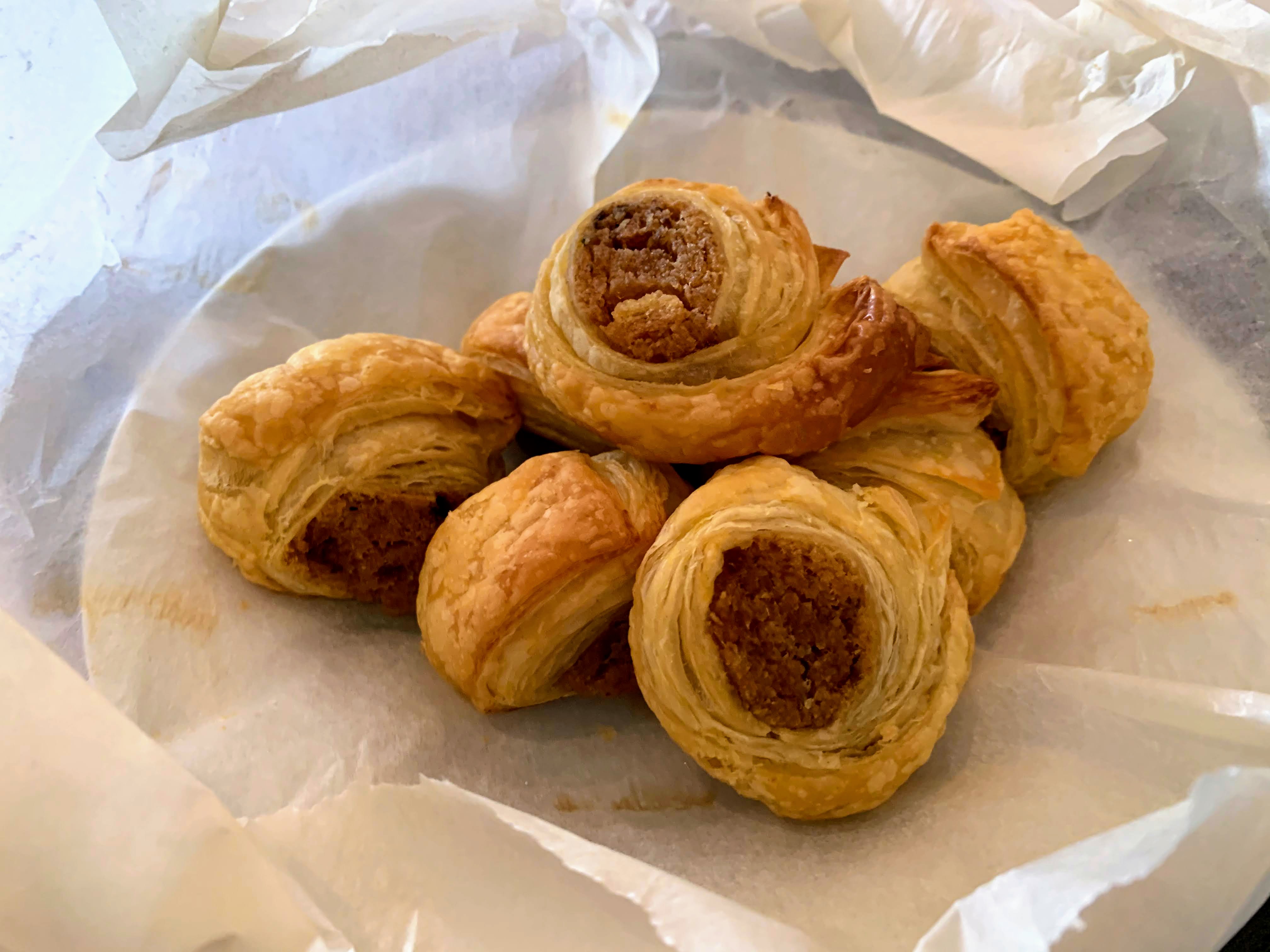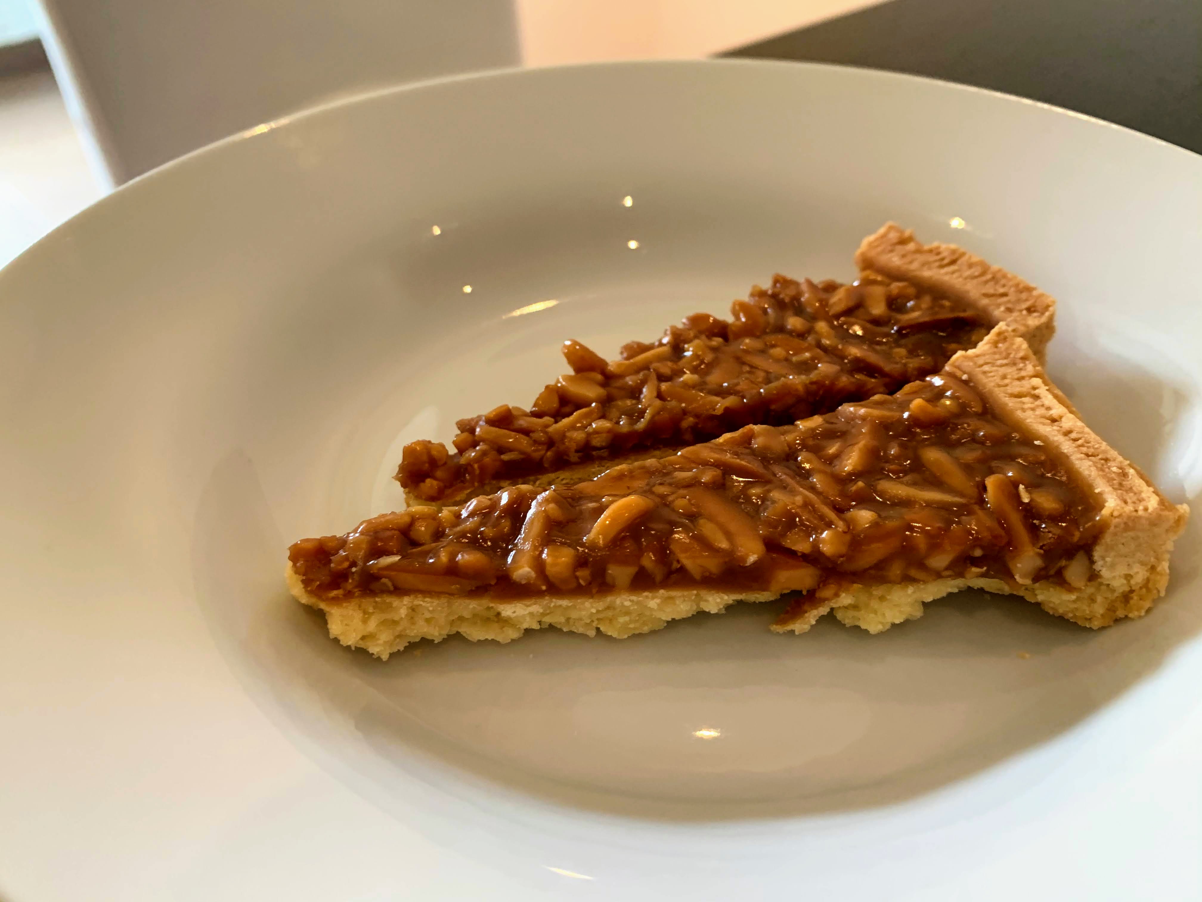 Mini folhados Alheira de caça (Portuguese bread sausage puff). Again it’s easy to bake.Shoot! I forgot to take a picture of the fish out of oven…It was beautiful…It was very good. Since the fish itself tastes very light and bland, bacon gives a flavor with freshness of cilantro & lemon. @ 2:10 p.m. Dessert: Tarte de Amêndoa @ 2:40 p.m.