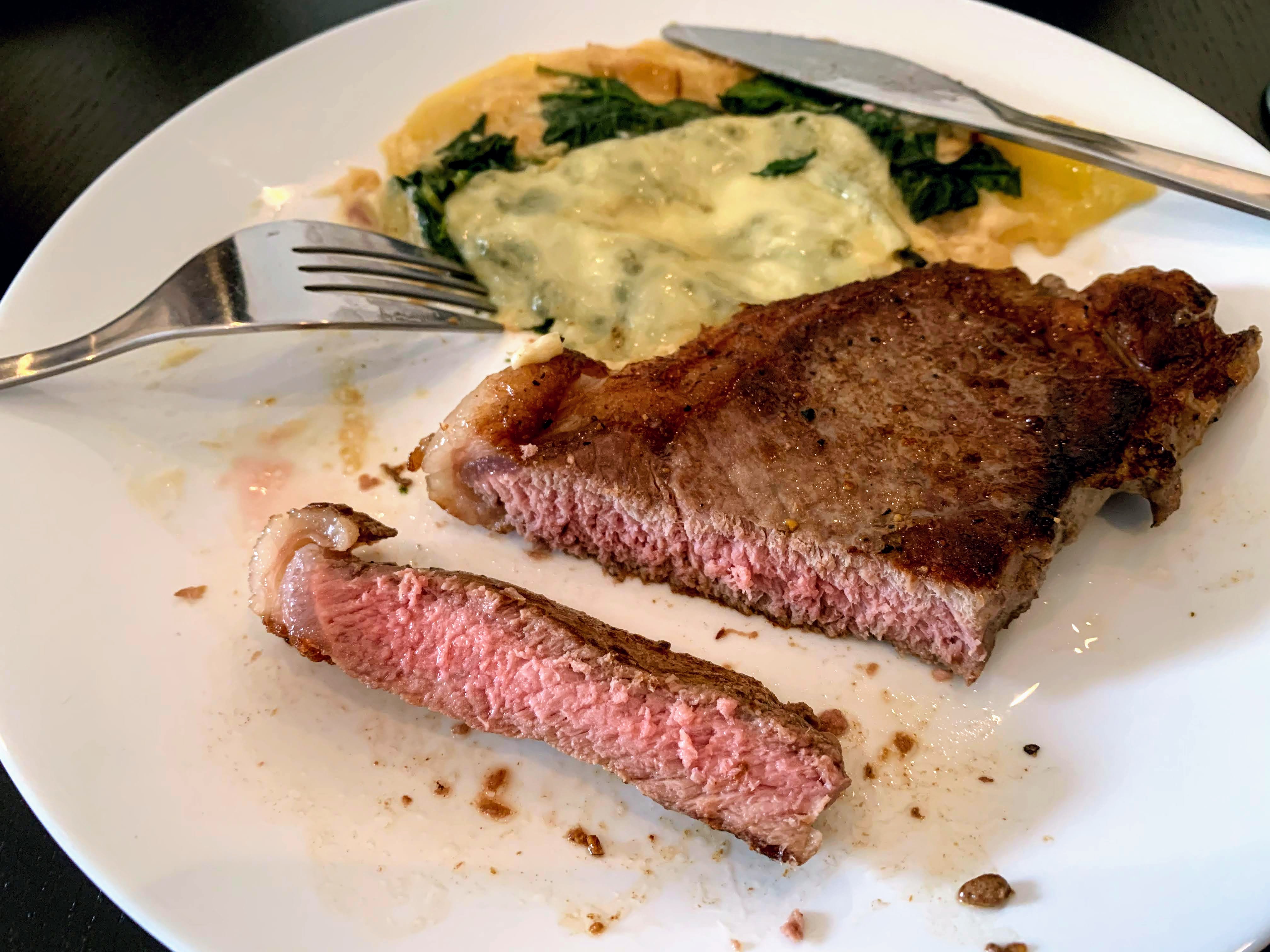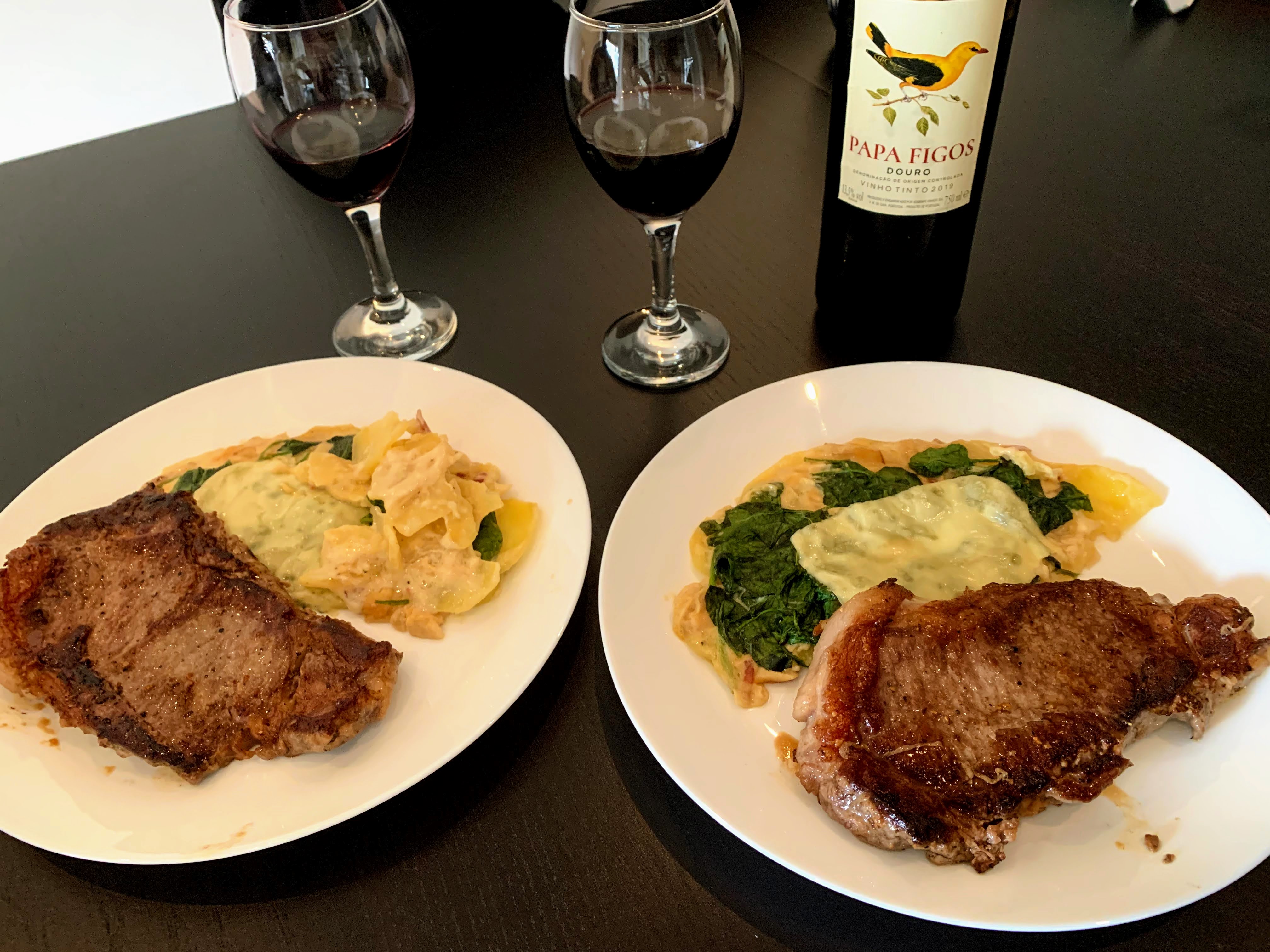 Breakfast: Bolo de laranja, coffee @ 8:30 a.m.I made Arroz de Polvo (Octopus rice) with leftover canned octopus @ 9:50 a.m.Lunch: Black Angus Vazia steak (probably sirloin), potato gratin, red wine @ 1:30 p.m.Potato gratin was good. The steak was a little dry. I like entrecôte (ribeye) better.Dessert: Tarte de amêndoa