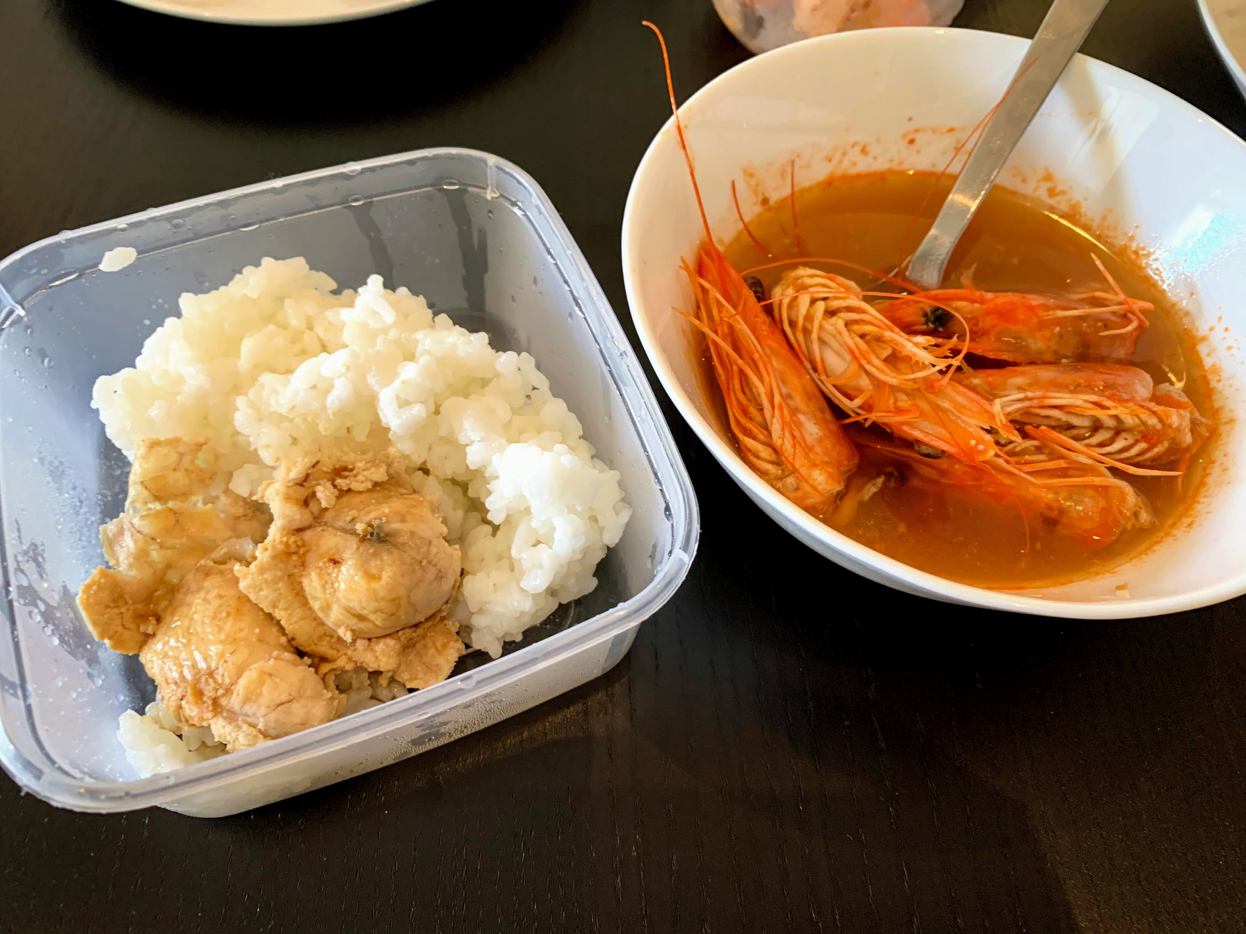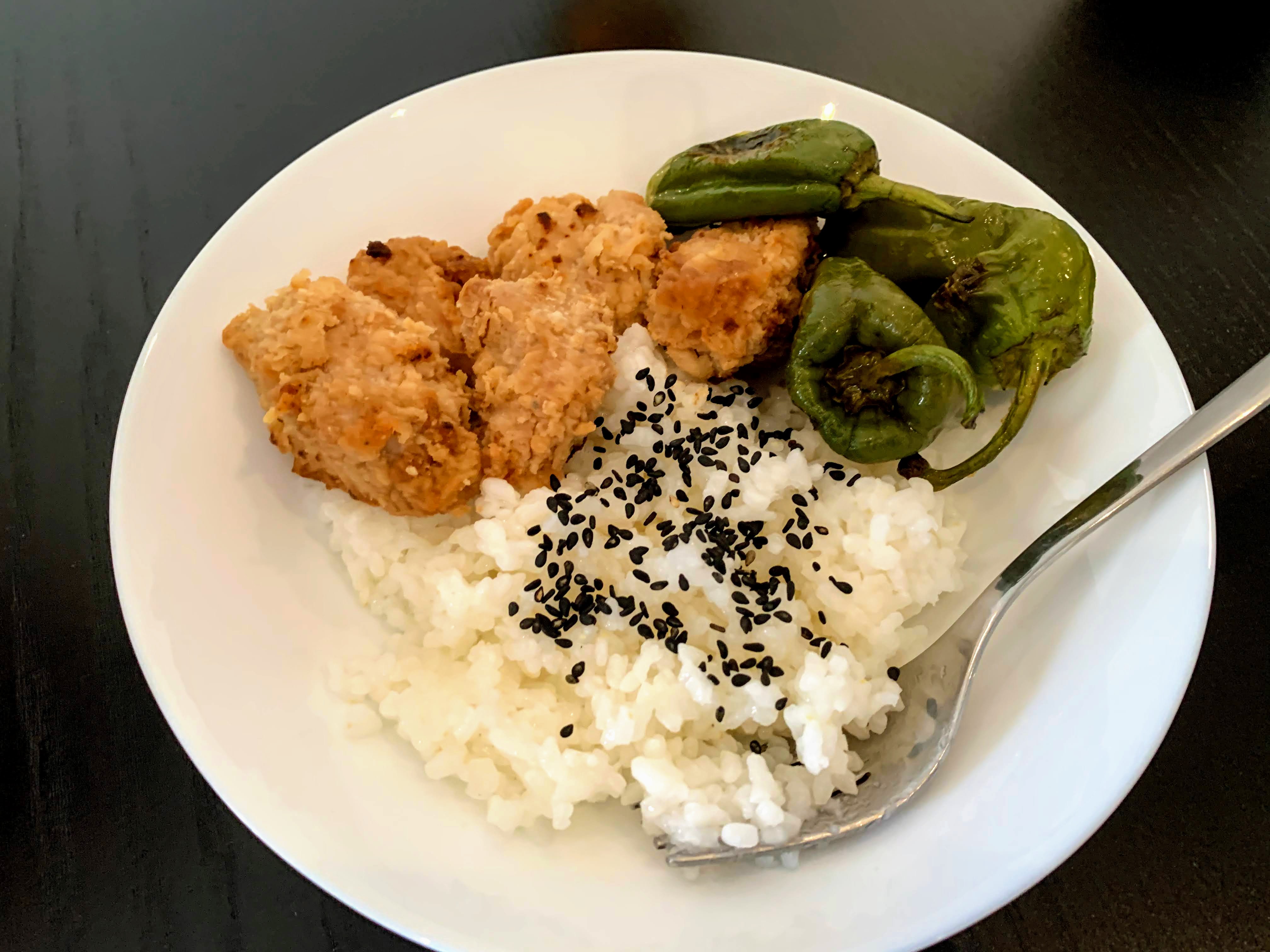 Adding to leftover karaage & “shishito” pepper, I quickly made shrimp head miso soup & cod egg rice