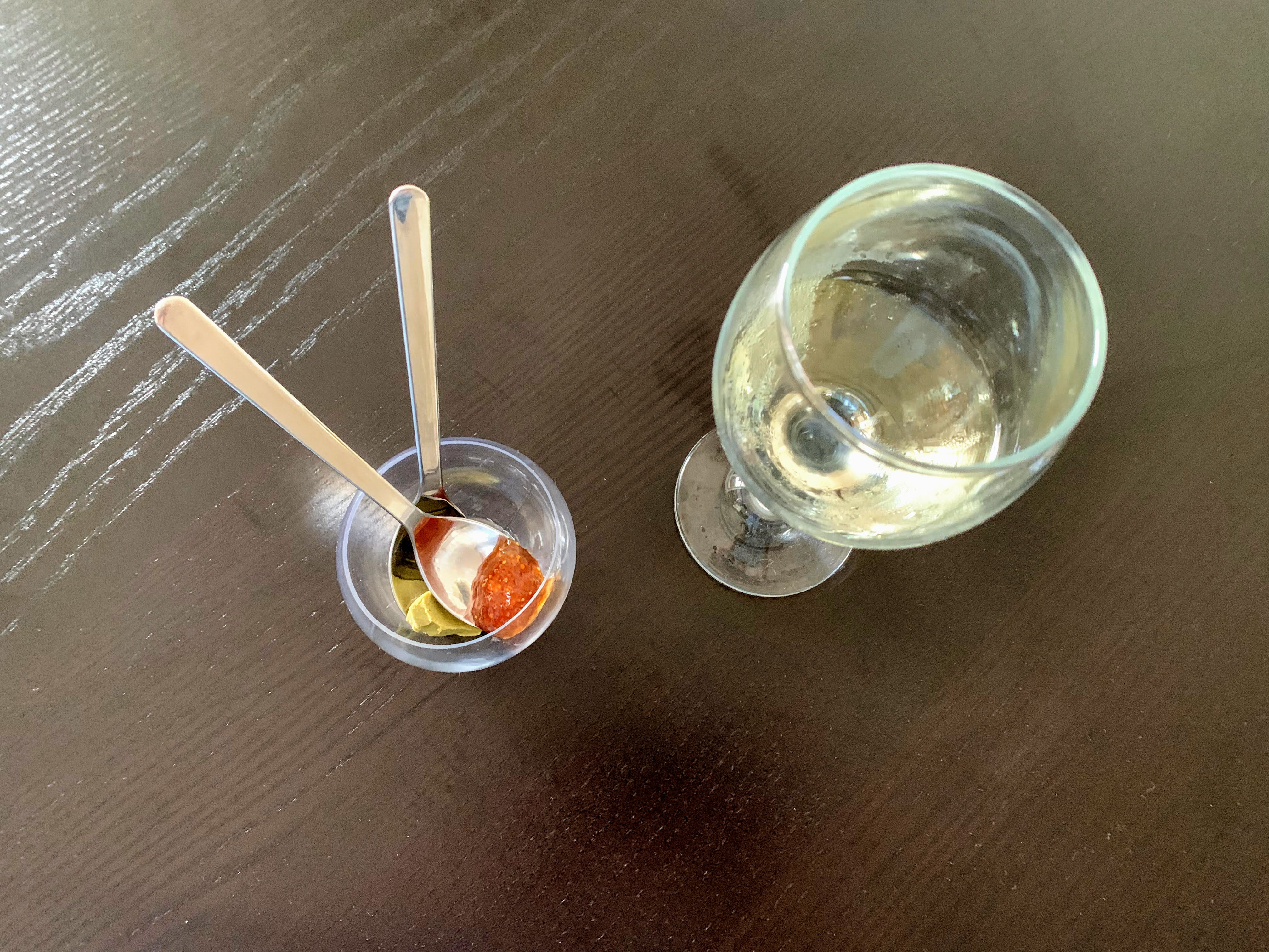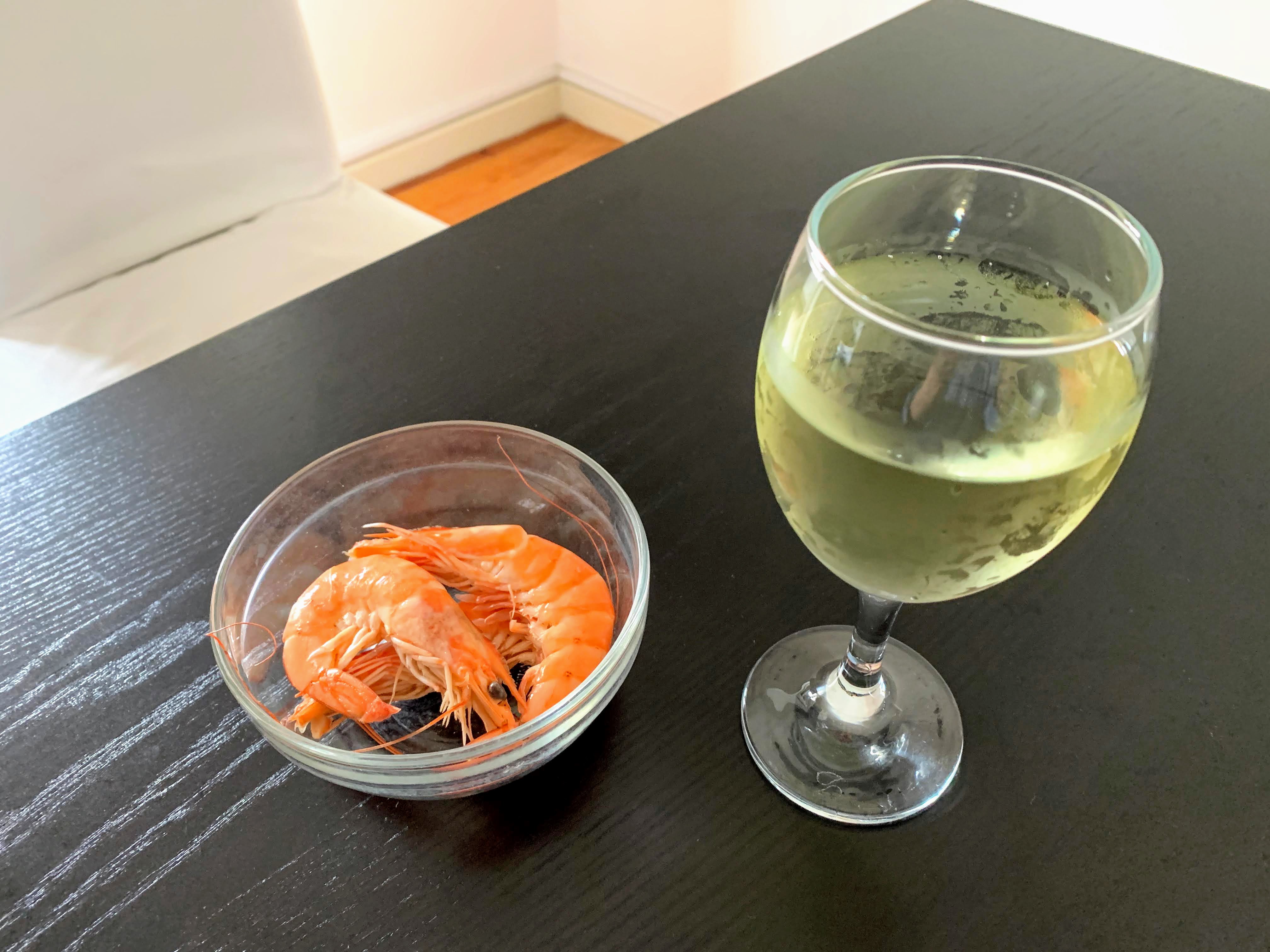 Try to pair different stuff (shrimp, pistachio cream, fig jam) with white wine after grocery shopping @ 12:00 p.m.