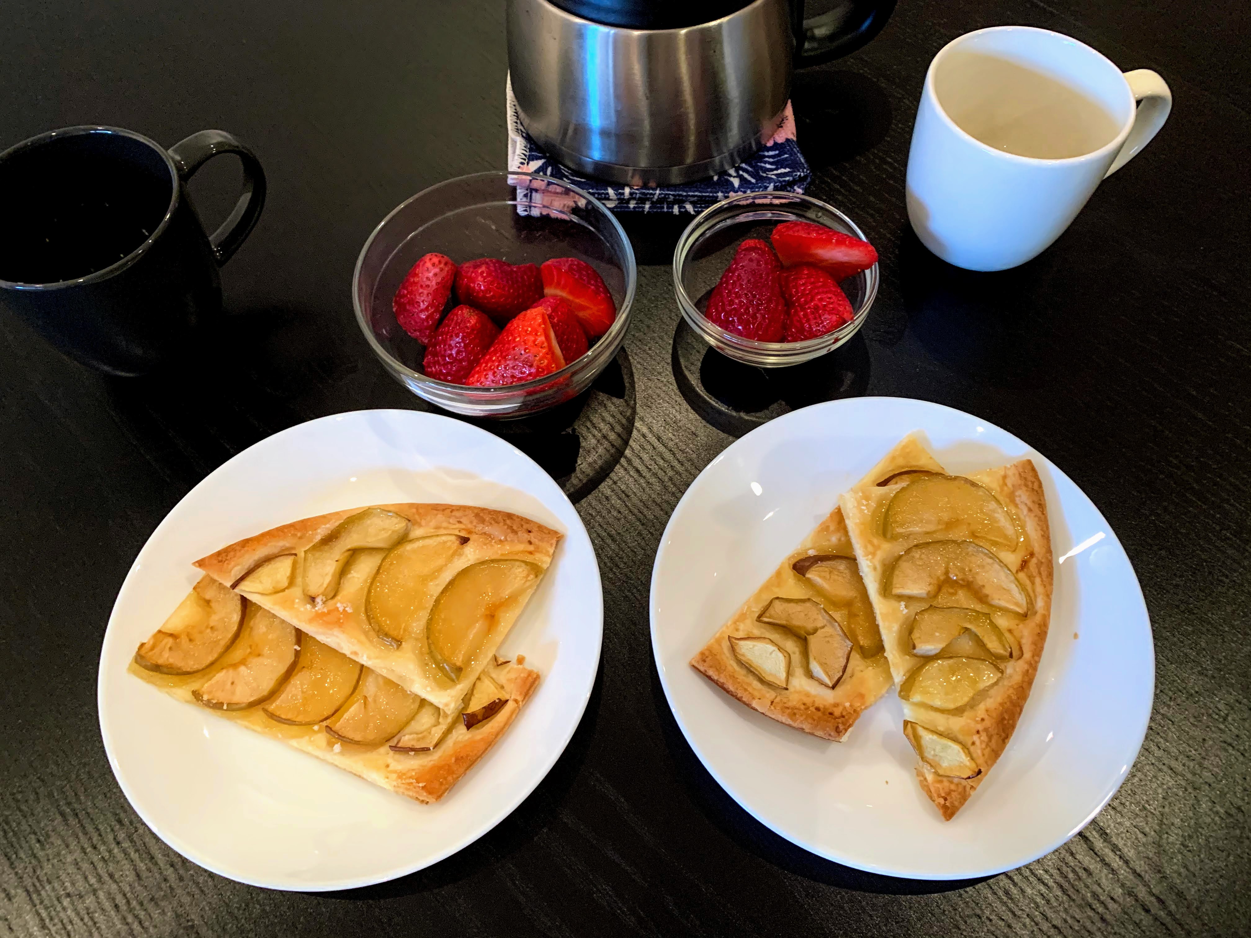 I really like this easy recipe of Apple Pastry. No need to measure anything and ready after 30 minutes in oven.Breakfast: Apple pastry, strawberries, coffee @ 7:15 a.m.Caldo verde @ 9:45 a.m.Shrimp two ways, salad & crispy shrimp with Dão white @ 12:00 p.m.More apple pastry @ 12:30 p.m.
