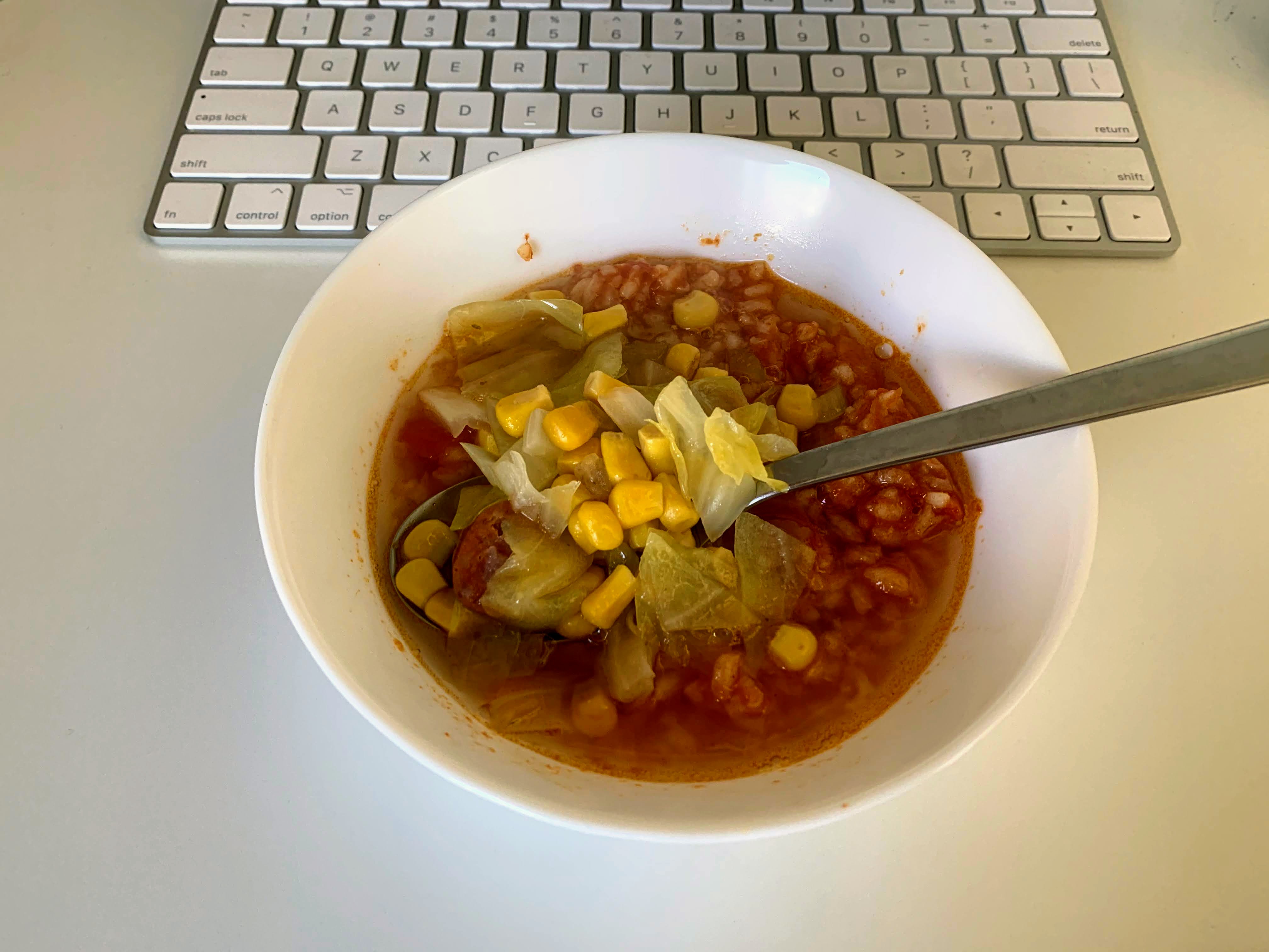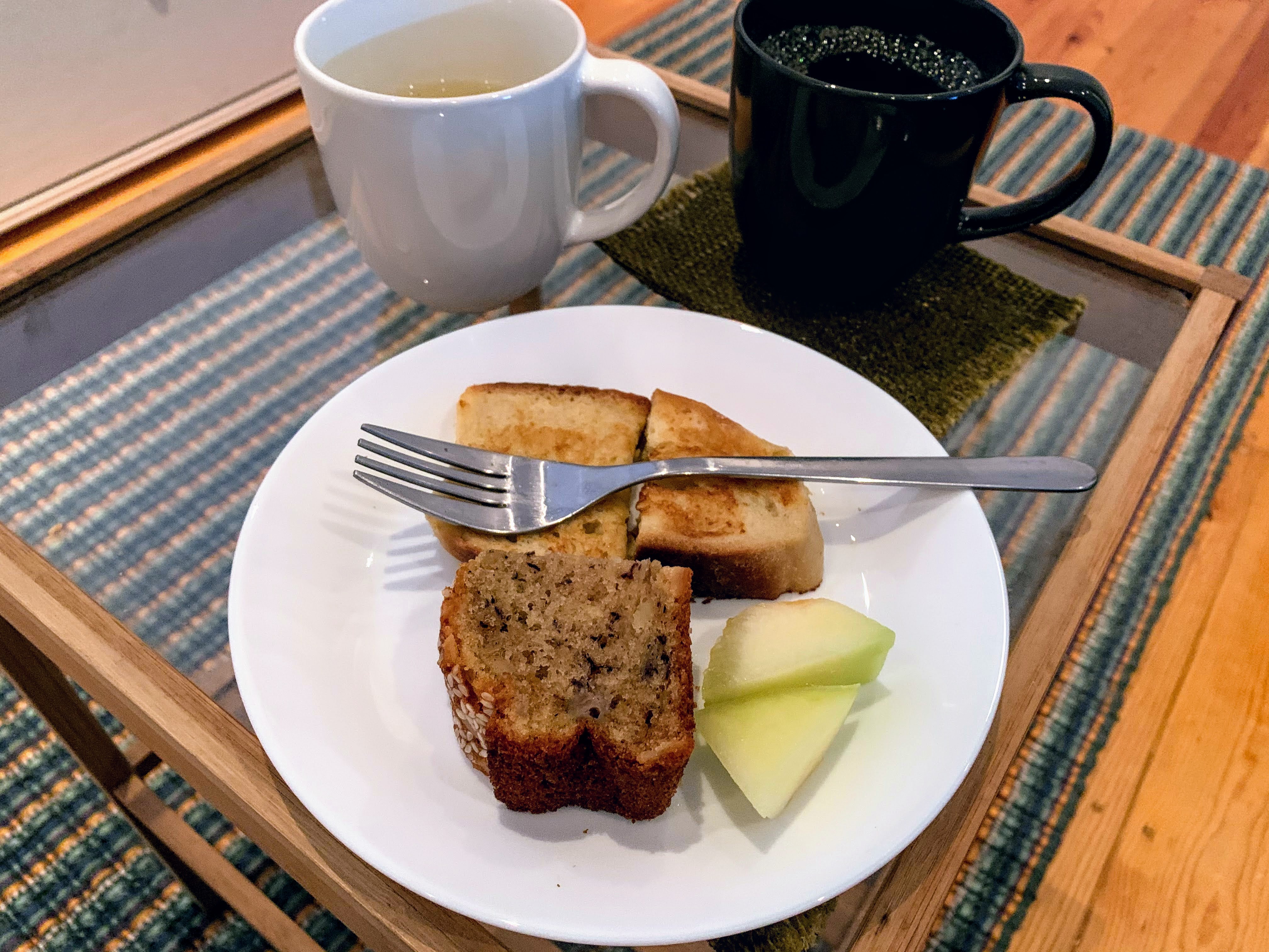 Banana bread & french toast, melon, coffee @ 7:20 a.m., Soup @ 10:30 a.m.