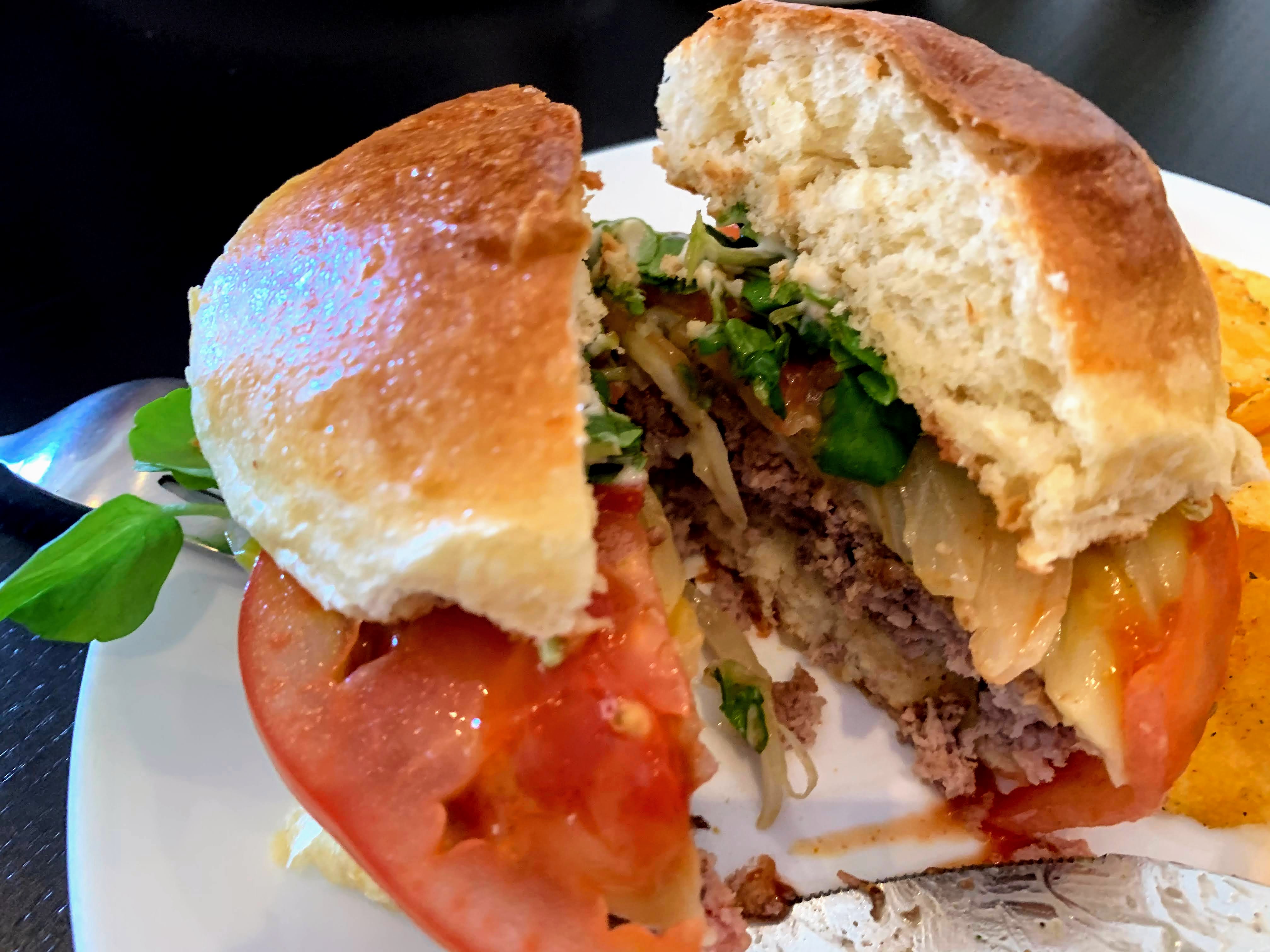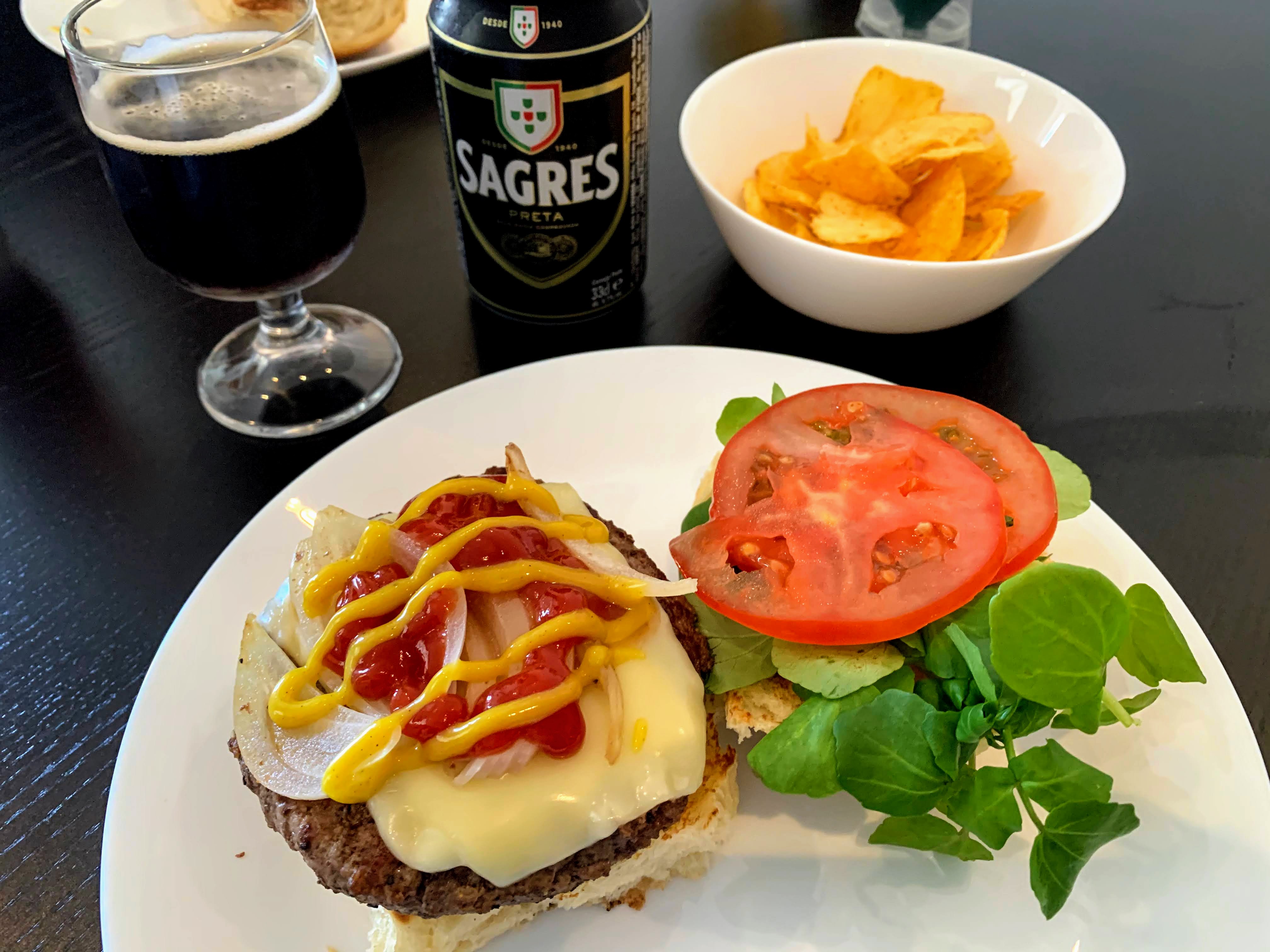 Lunch: Angus beef burger, Portuguese beer, chips @ 1:10 p.m.
