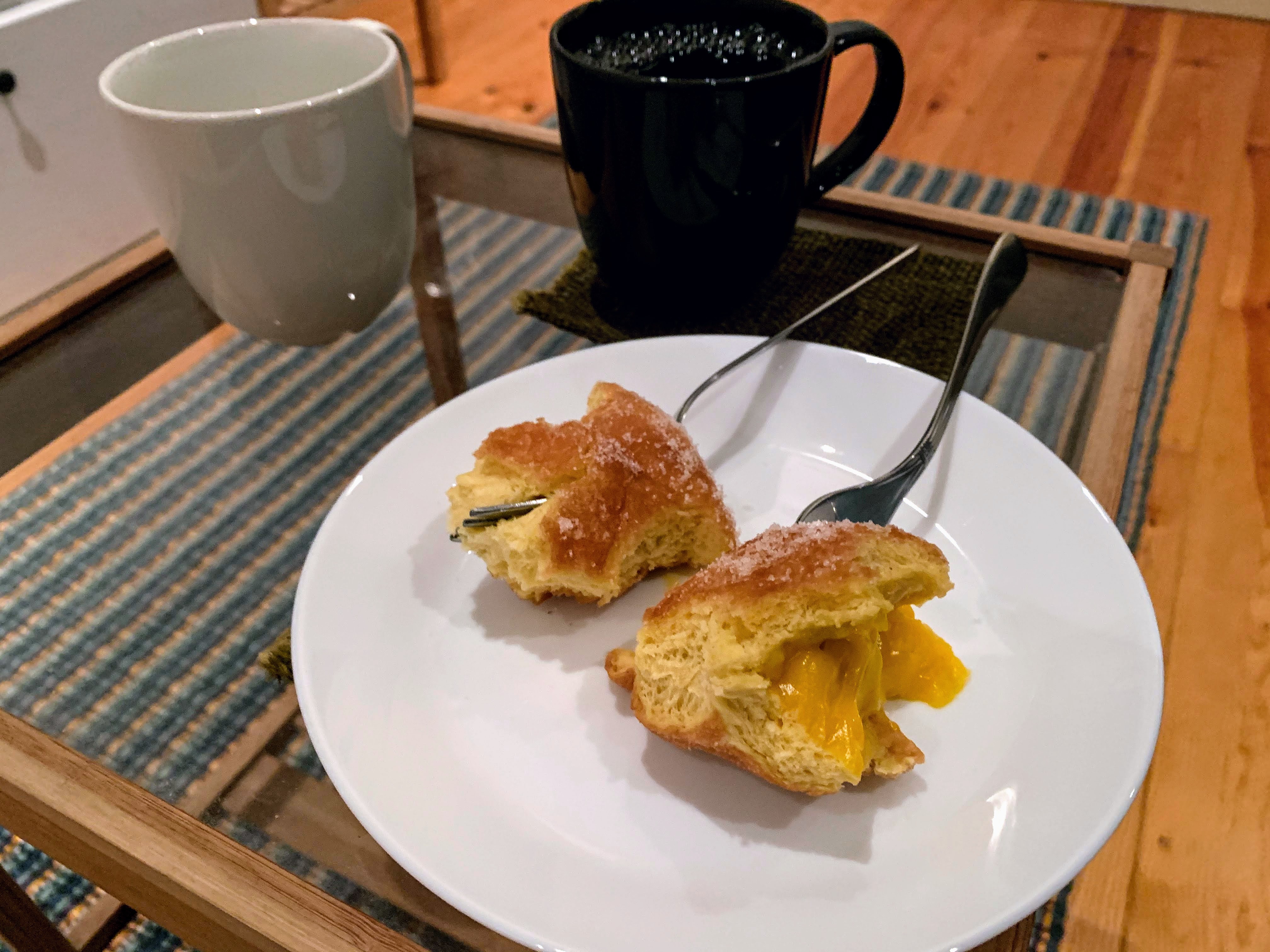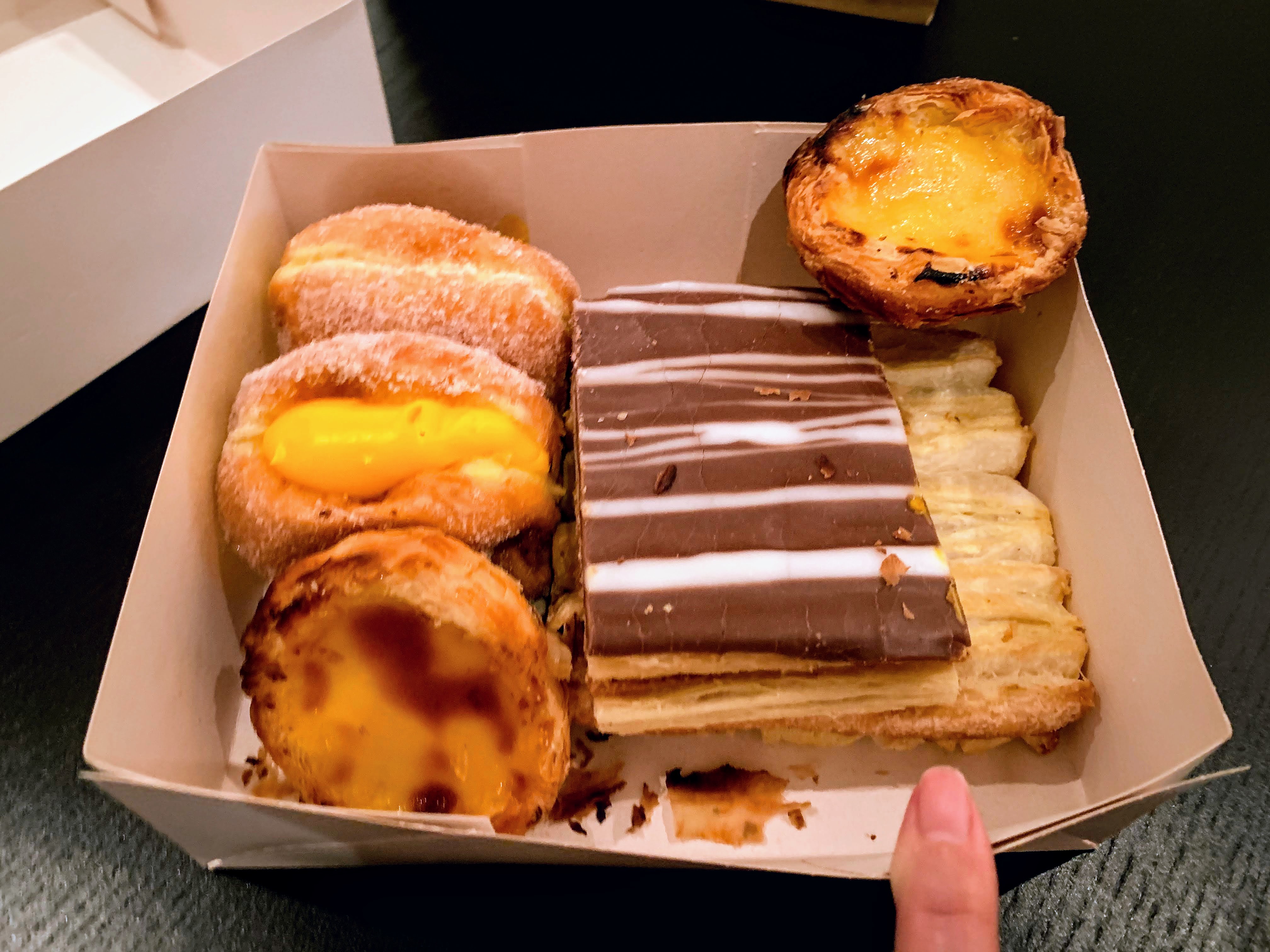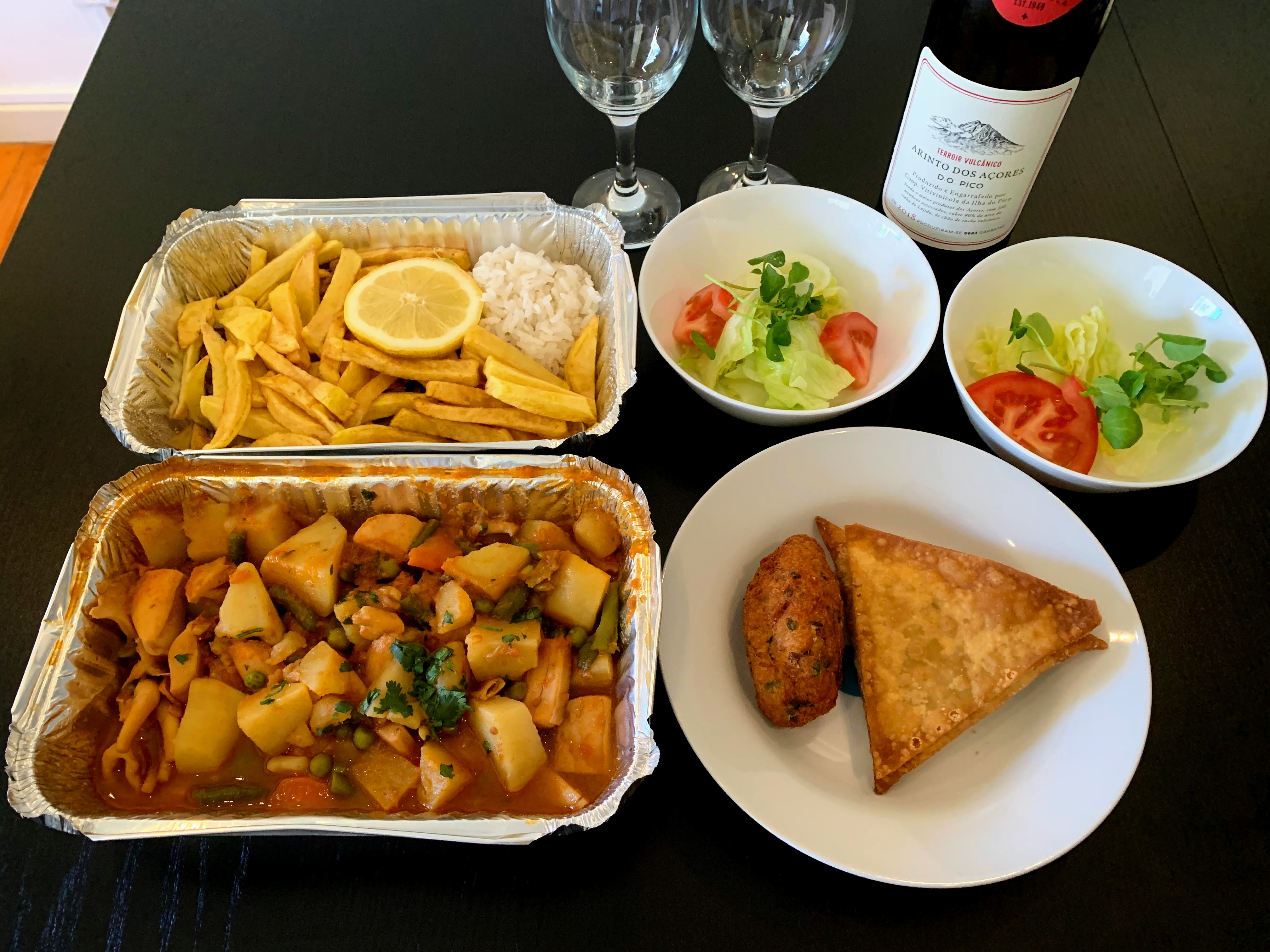 There is a bakery/factory that has been recommended by several articles but this place is open only from 9:00 p.m. to 6:00 a.m. Since we are already in bed at 9:00 p.m., I placed an order through UberEats for delivery between 5:30-6:00 a.m., which is the latest option. Here it is! It arrived on time. The delivery person was so considerate not to ring the entrance bell that would be disturbing to the entire building but to text me when arrived so he could hand me the bag without noise.Box Santos Populares 6 Unidades (2 Pasteis de Nata, 1 Bola de Berlim com Creme, 1 Bola de Berlim Simples, 1 Mil-Folhas and 1 Palmier Recheado) 7€ + Delivery fee & TipBreakfast: Bola de Berlim (simple one & with cream), coffee @ 6:40 a.m., We split. Picked up lunch at Pirata. Say hello to the senhores after several weeks absence.Lunch: Grilled veal chop under rice and fries (Costeleta de novilho na grelha), Cuttlefish stew (Jardineira de choco à primavera) + pastel de bacalhau, chamuça + Azores white (Arinto de Pico) 1:00 p.m.Good food and good wineDessert: Pastel de nata and samples of mil-folhasYogurt @ 6:30 p.m.