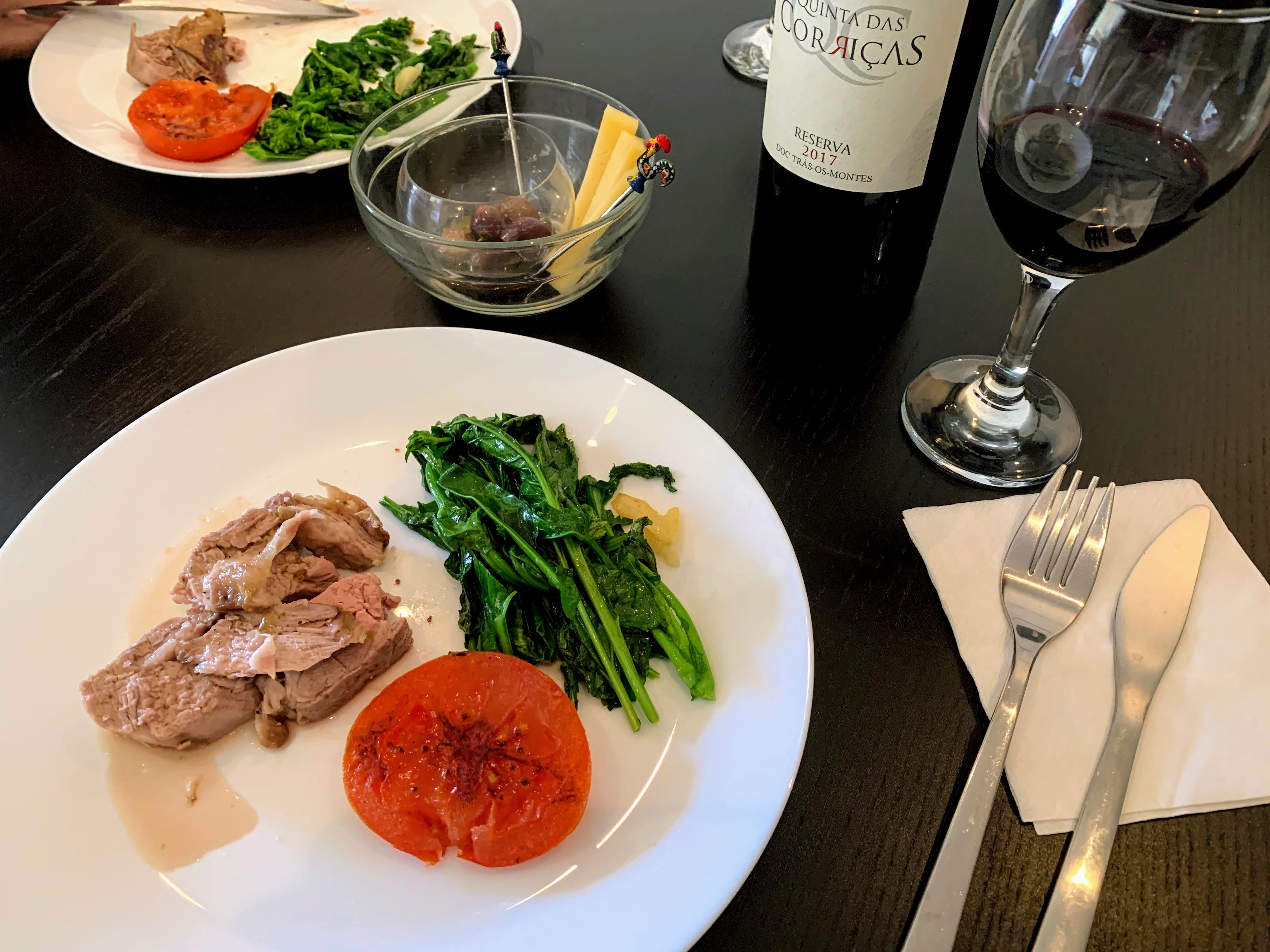 Saturday morning, we walked to Marques de Pombal to order a Cartão de Lisboa VIVA, which functions as a monthly pass or balance card for the public transportations in Lisbon area. Stopped by the mercado on the way home to look for duck breast but only a whole duck was available. So we got pork cheek and a rack of lamb. The butcher offer to separate by bone, but somehow I refused. Opened a bottle of Tras-os-Montes red. I love it.Lunch: Roasted lamb, grelos, tomato @ 1:30 p.m., I roasted the whole rack in oven and cut for chops afterwards, but couldn’t. I regret I didn’t follow the butcher suggested.I had fish roe and grelos spaghetti, he had leftover pork and rice.Chocolate and a little more wine @ 2:40 p.m.