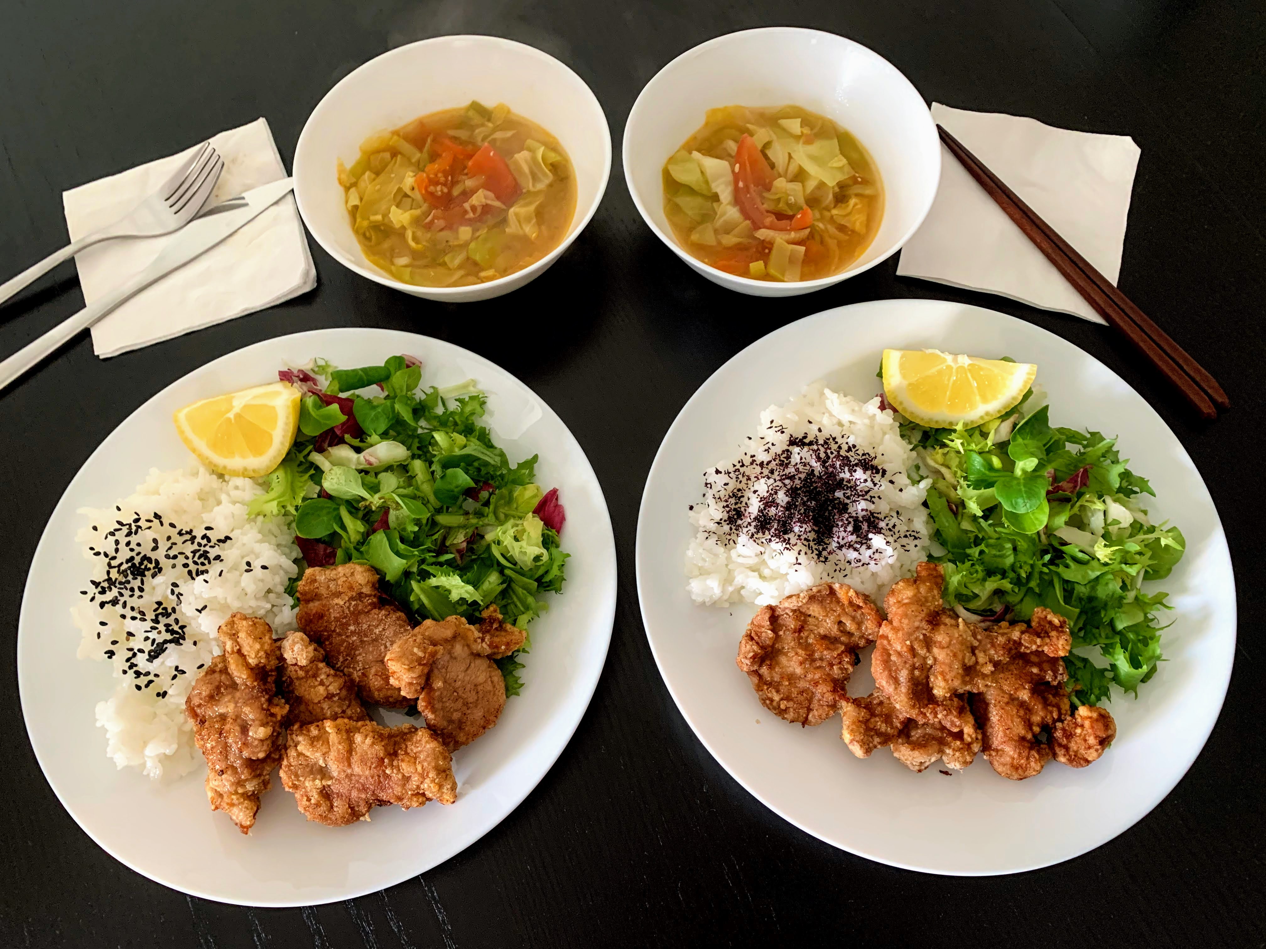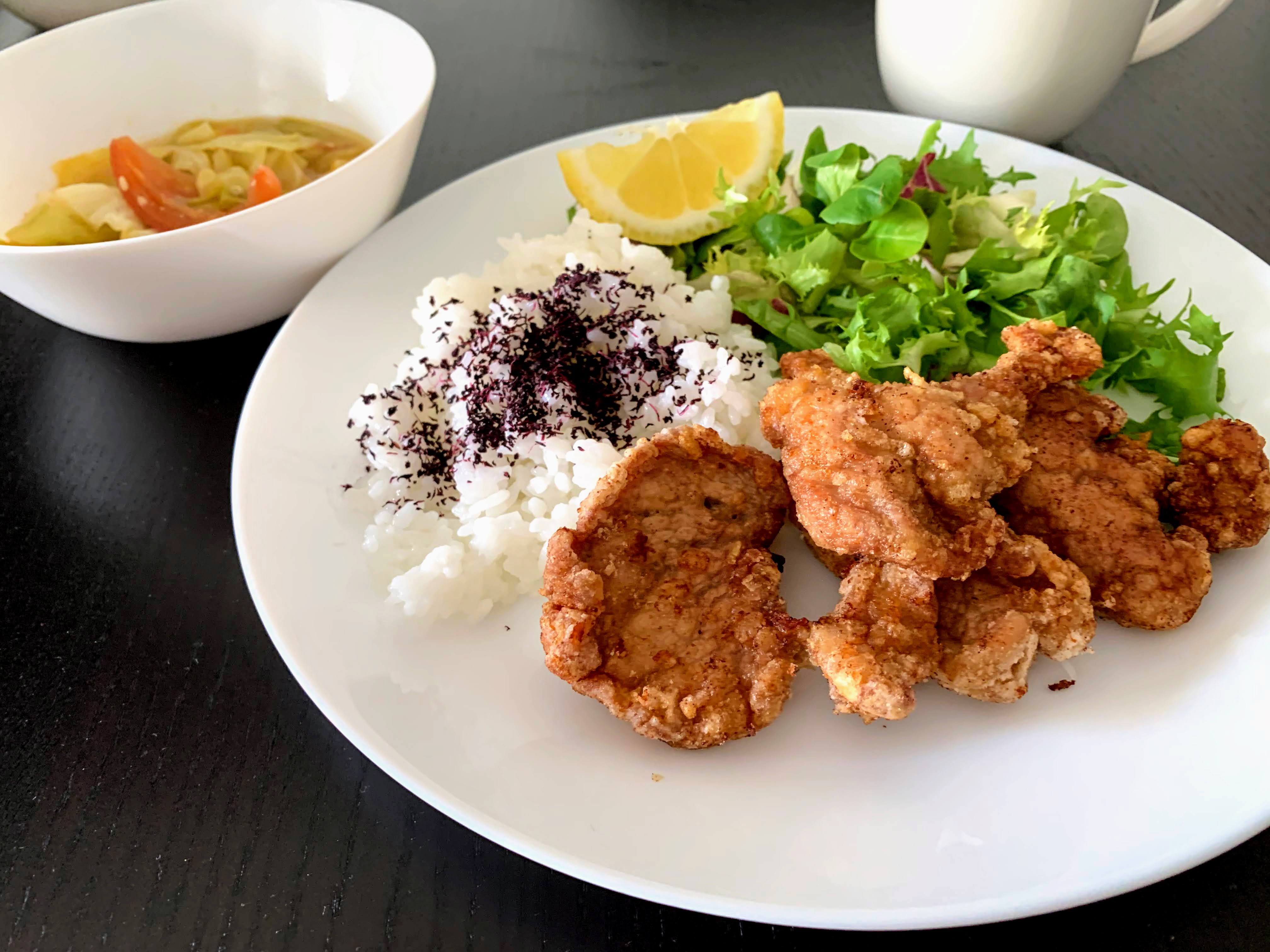 HomePork Karaage April 4, 2021April 4, 2021 myeverydayeats Lunch: Pork Karaage, salad, rice, miso soup @ 12:10 p.m. I was craving for Karaage, usually chicken but there was only pork in the fridge. It turns really nice and the furikake (ゆかり)was so delicious with shiso flavor. Another round(おかわり) ********************************************************* Breakfast: Bolo de bolacha, orange, coffee @ 8:00 a.m.