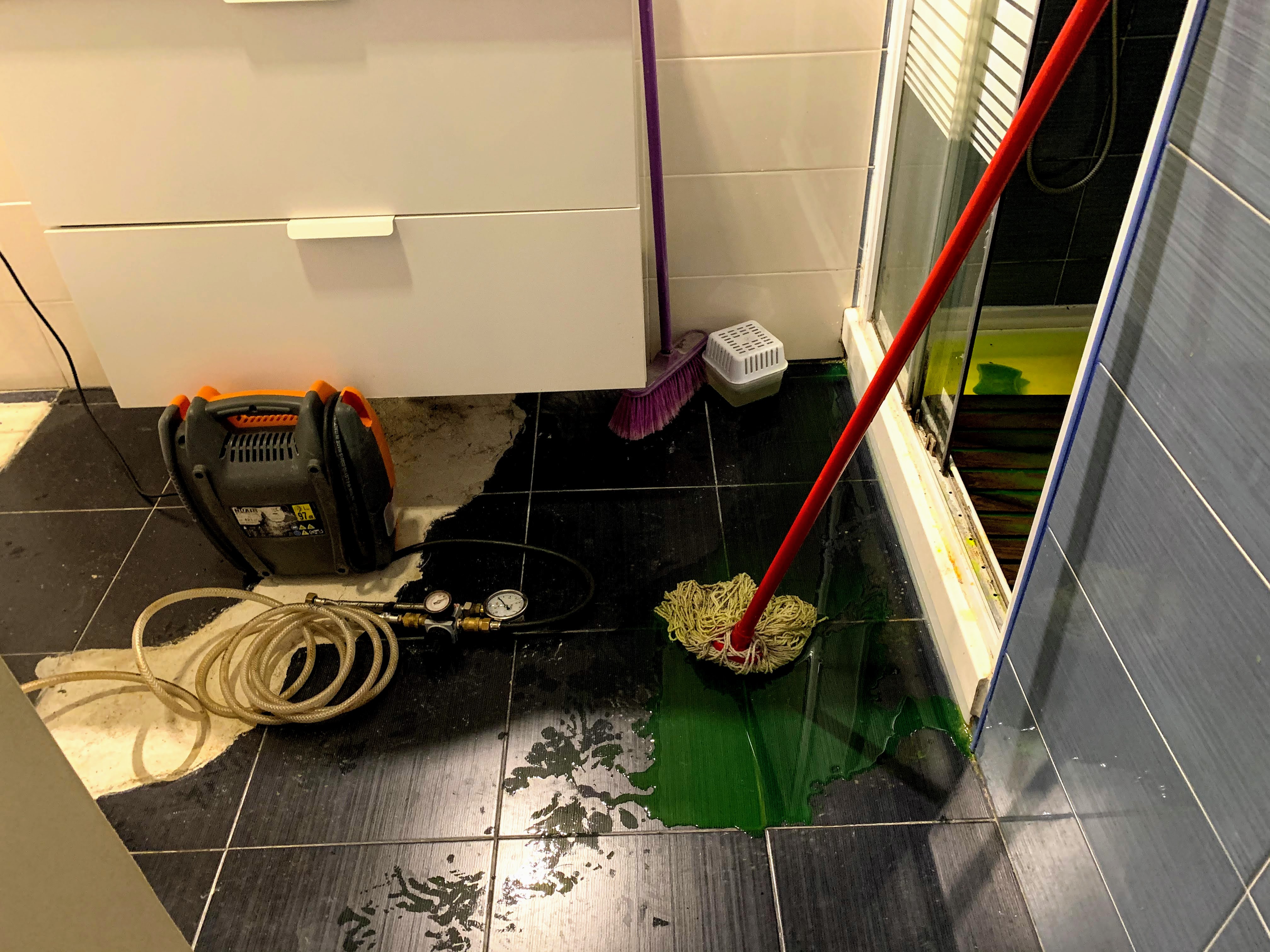 The inspector and the landlord came this morning to operate a lot of tests to find what causes water leak down and upstair units of us. He injected colored water then gas to pipes but still couldn’t find the spot. “Está estranho.”