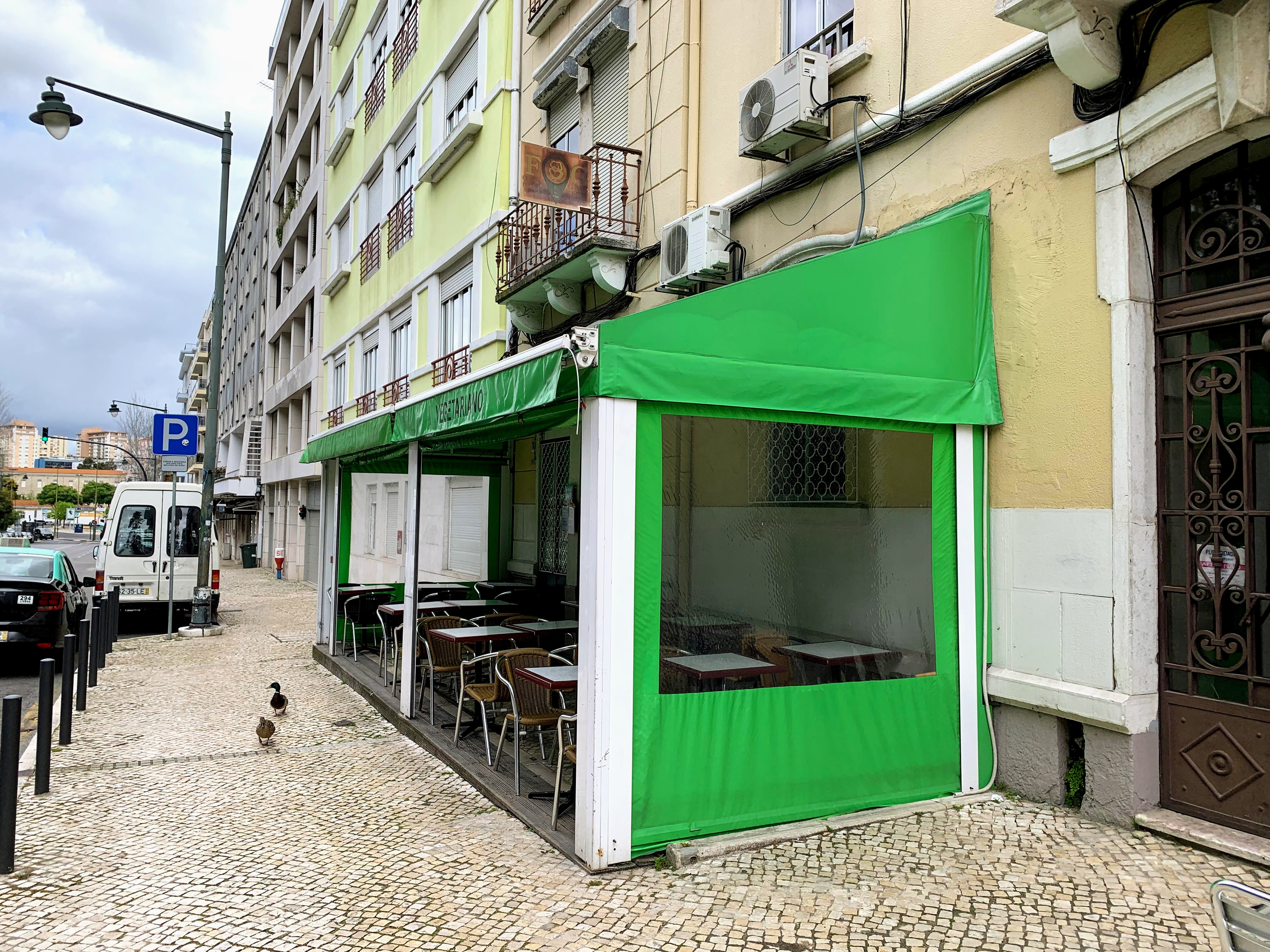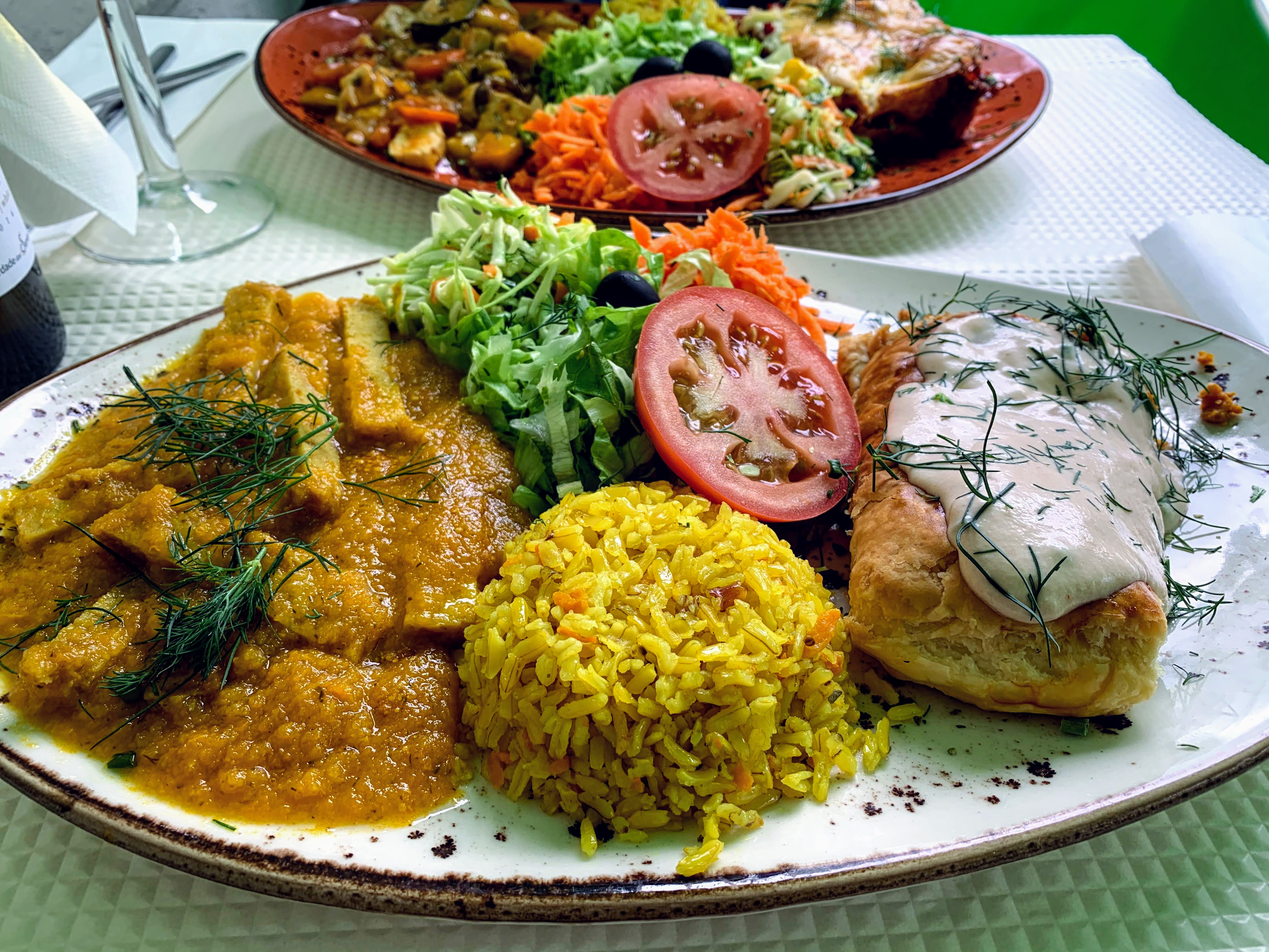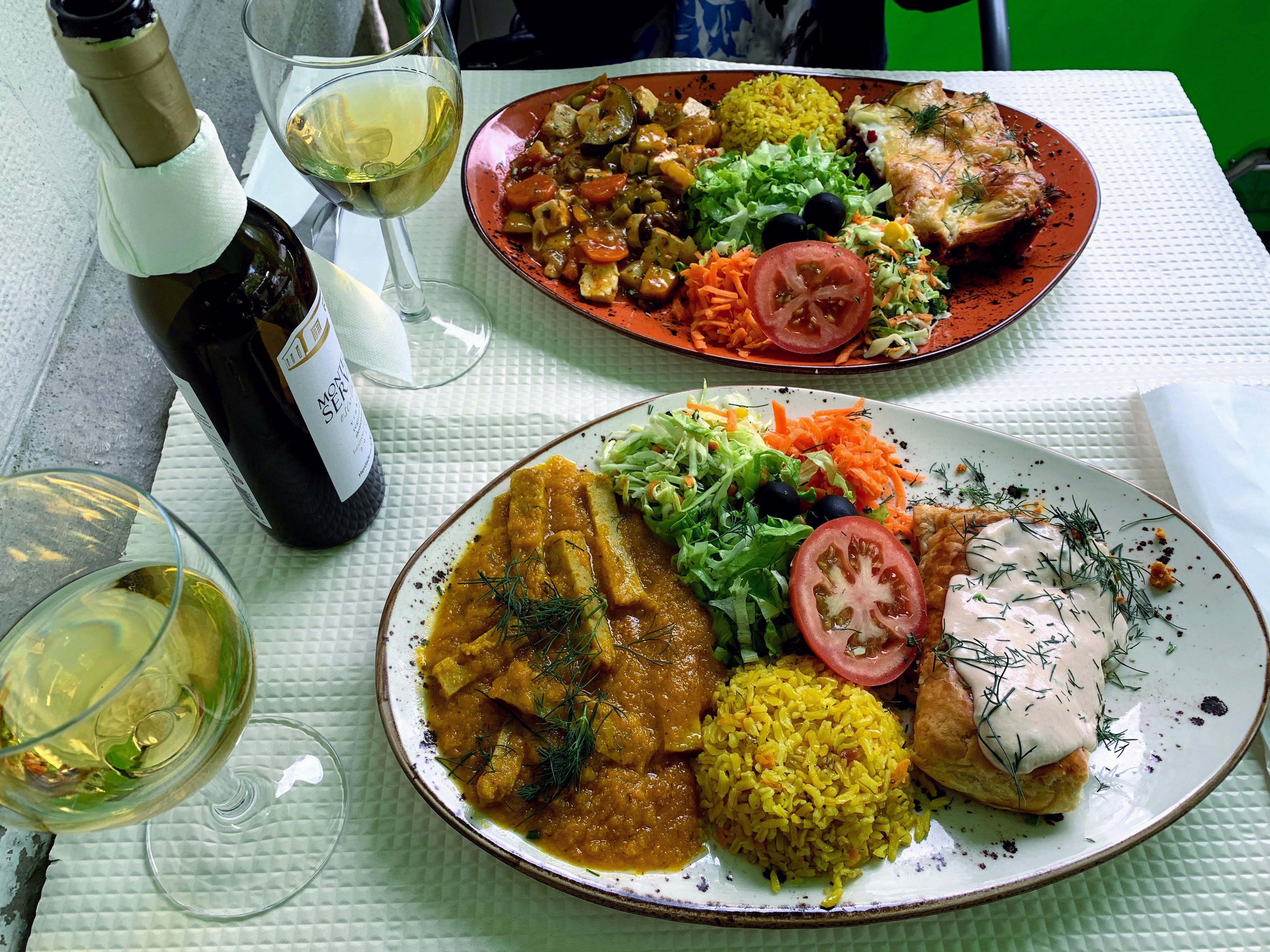 I got together with a friend for the first time after 3-month “lockdown” at a vegetarian restaurant. We shared a half bottle of white wine (6.50€). By the way, two ducks were wandering on the sidewalk. They probably reside in the park across the street.Prato do Dia (today’s special): Tofu com legumes e cogumelos, Rolo belga, Seitan em molho de cenoura, Lasanha de beterraba. We both ordered Prato Misto with 2 choices of main (8.25€). I had rolo & seitan, she had tofu & lasanha. All of them were so tasty.Sides were farro, salad and cole slaw. Food was good and service was nice. I would definitely come back soon!