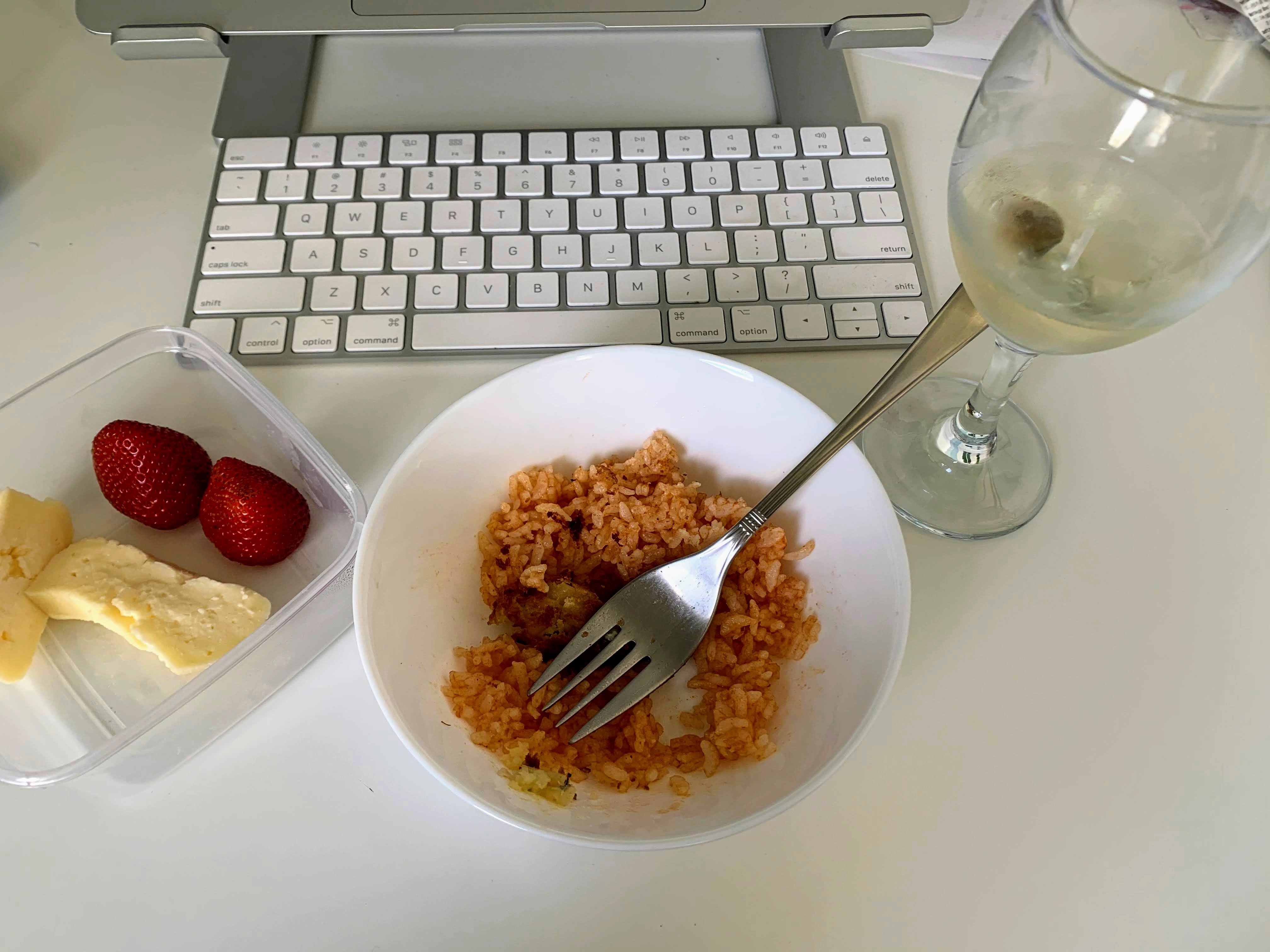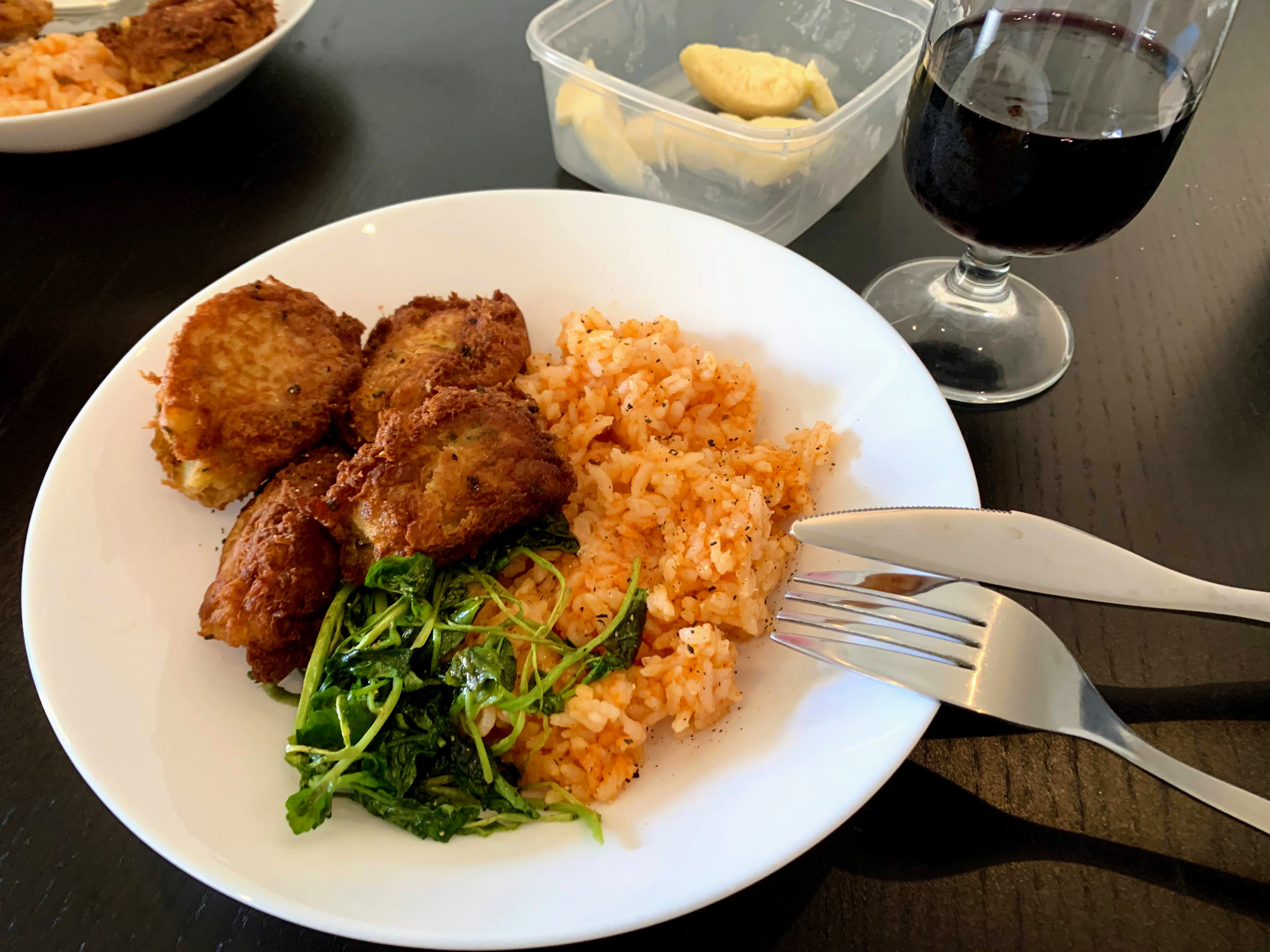 We took a 30 minute walk to Feira da Ladra, a famous flea market in Lisbon in the morning. It seems normal now that all venders and crowds are back to the street.We got home around noon and had iced tea, then I started cooking for lunch.Lunch: Pasteis de Bacalhau, tomato rice, cress, red wine @ 3:15 p.m.Dessert: Ice cream