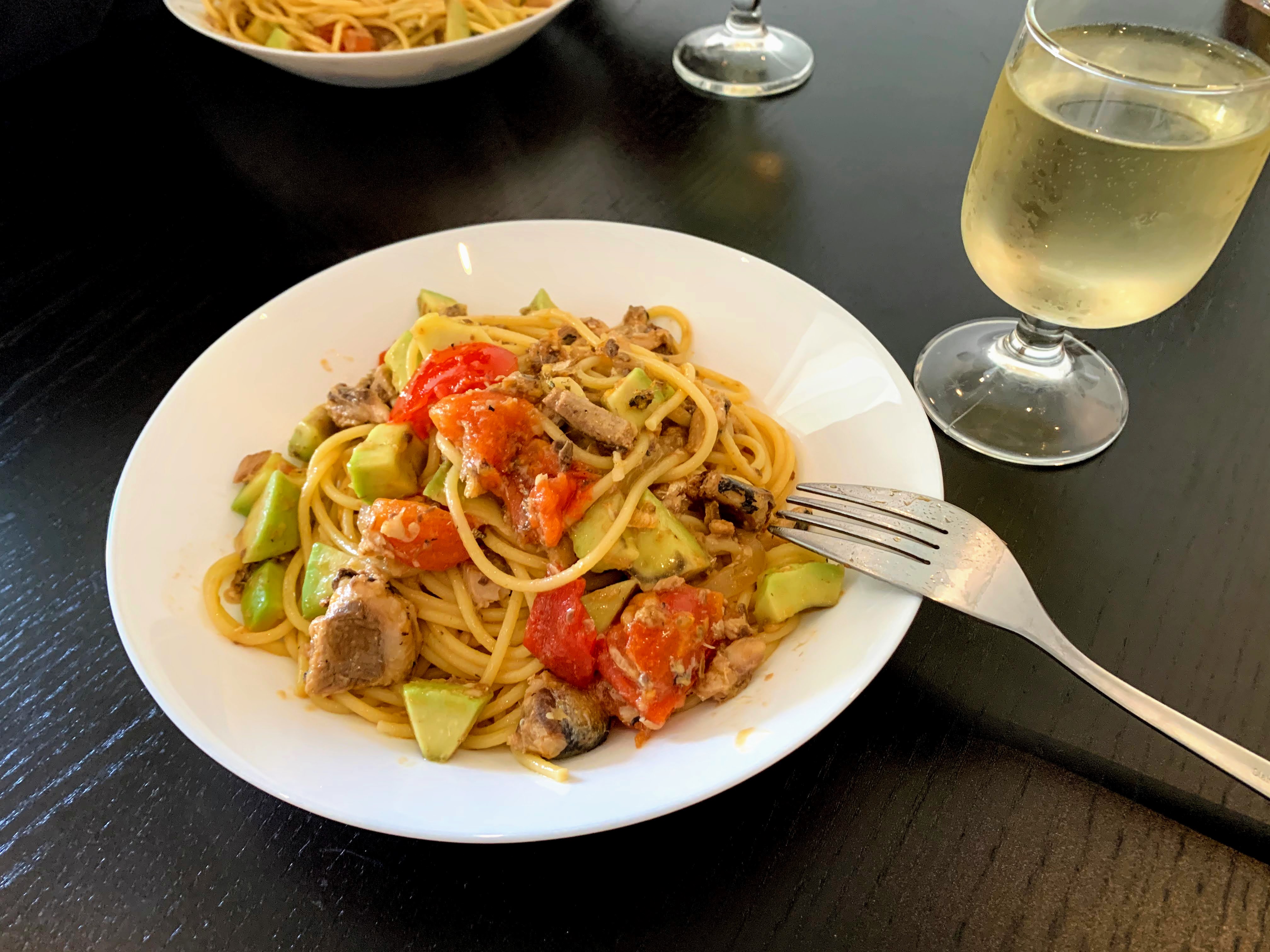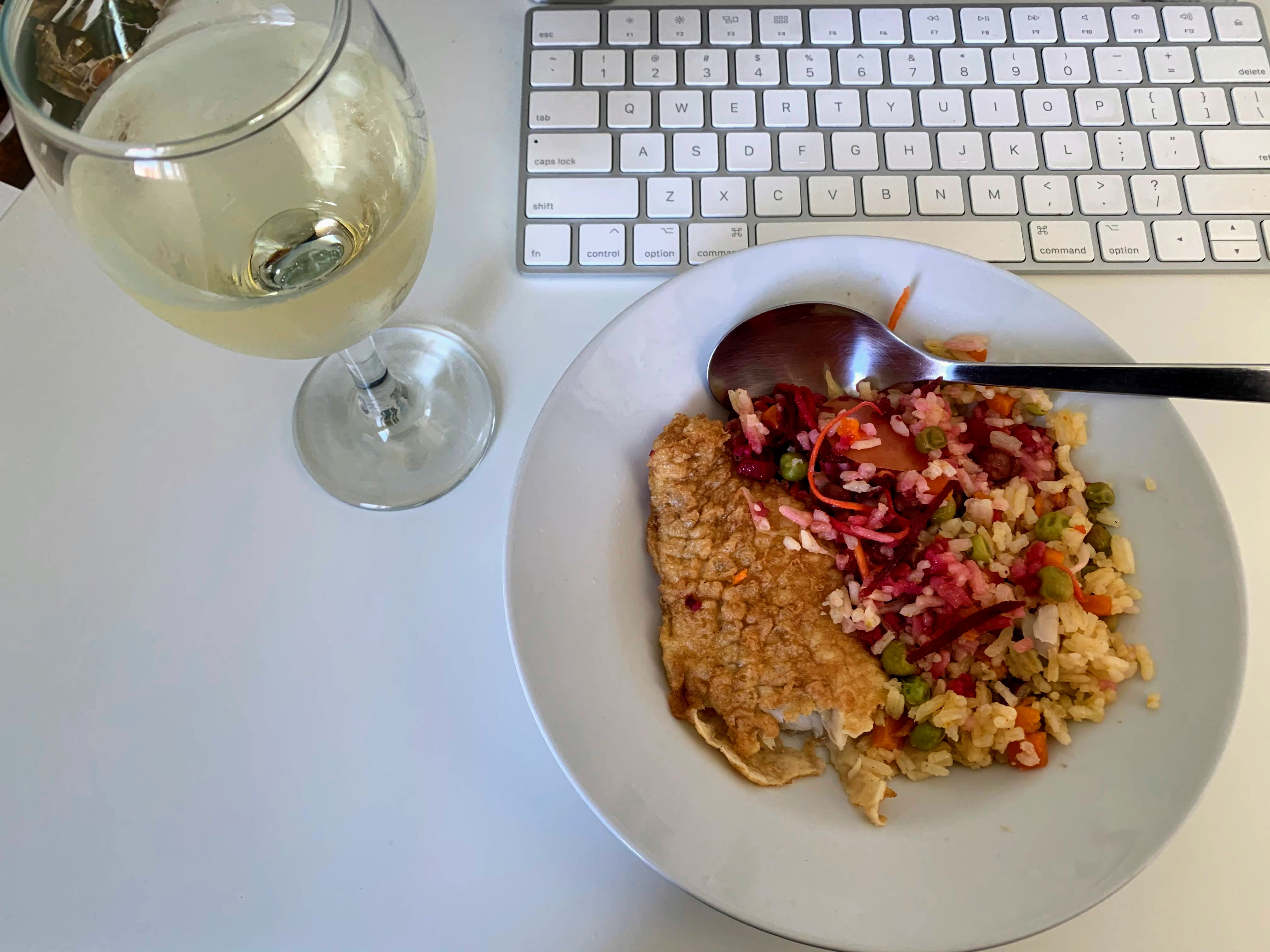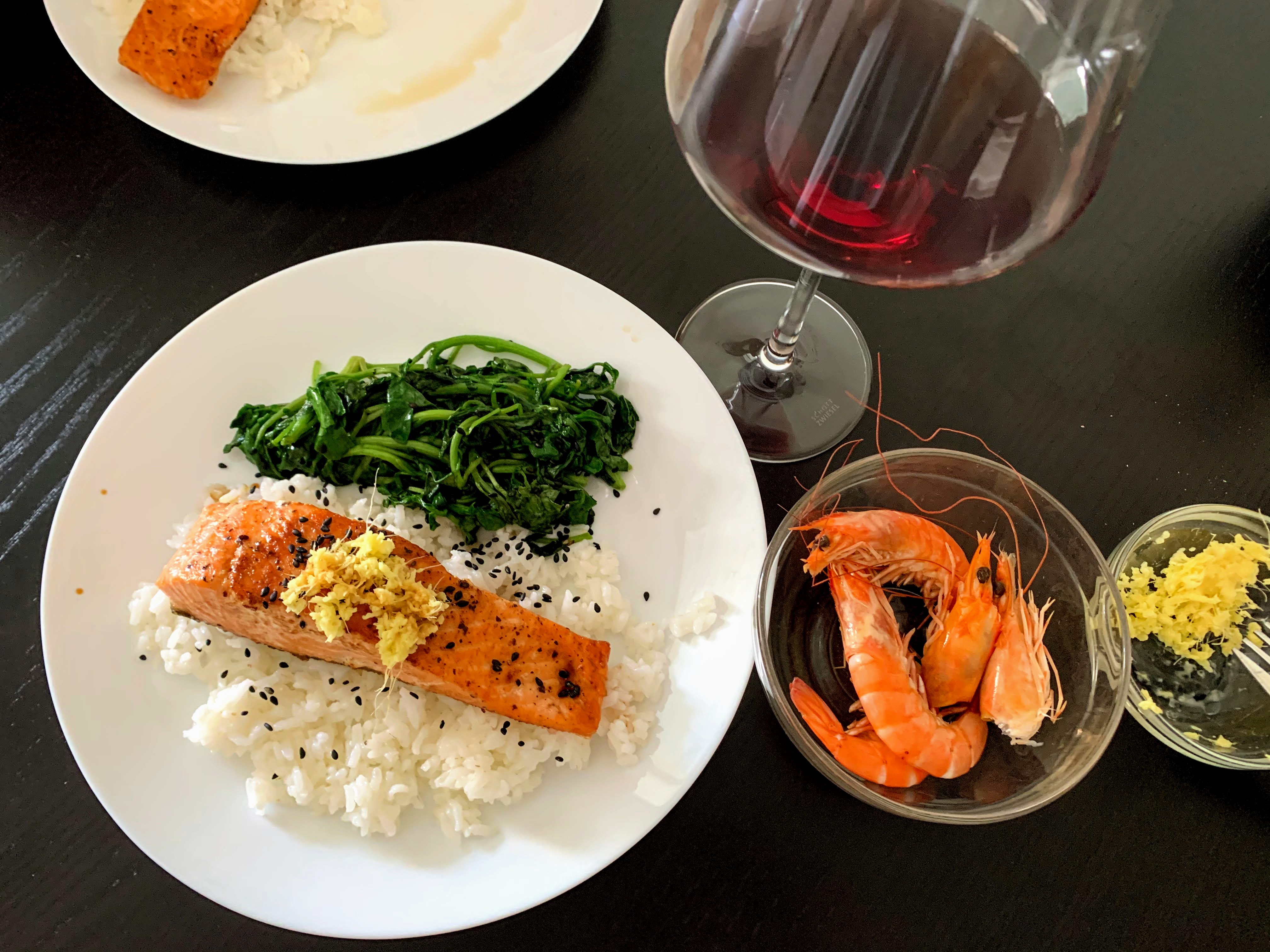 I was so relaxed to fully enjoy a wine @ 11:20 a.m. It’s hard to see in the picture, but it has a beautiful ruby color like pinot noir. So fruity and elegant. I really love this time of day. Peaceful and productive at the same time.Lunch: Shrimp, salmon with ginger, cress, rice @ 12:50 p.m.