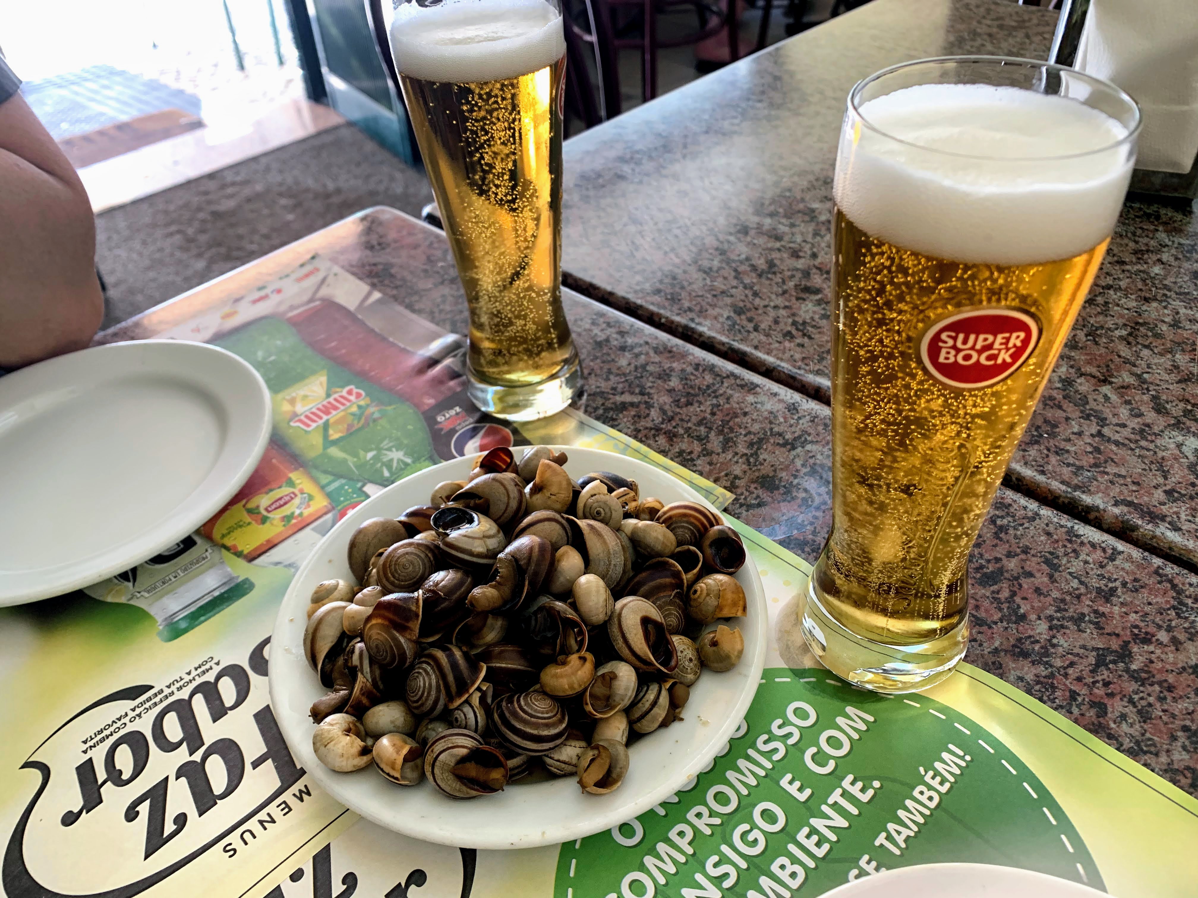The season of snails has come to Portugal. Everyone hangs out and enjoy caracóis e imperial (snails & draft beer) at the table outside. So we did too late afternoon on Sunday. When we tried them last summer I really couldn’t take it because they look just like snails. This time I really didn’t enjoy but it tasted better. I just wanna do as Portuguese people do 😛