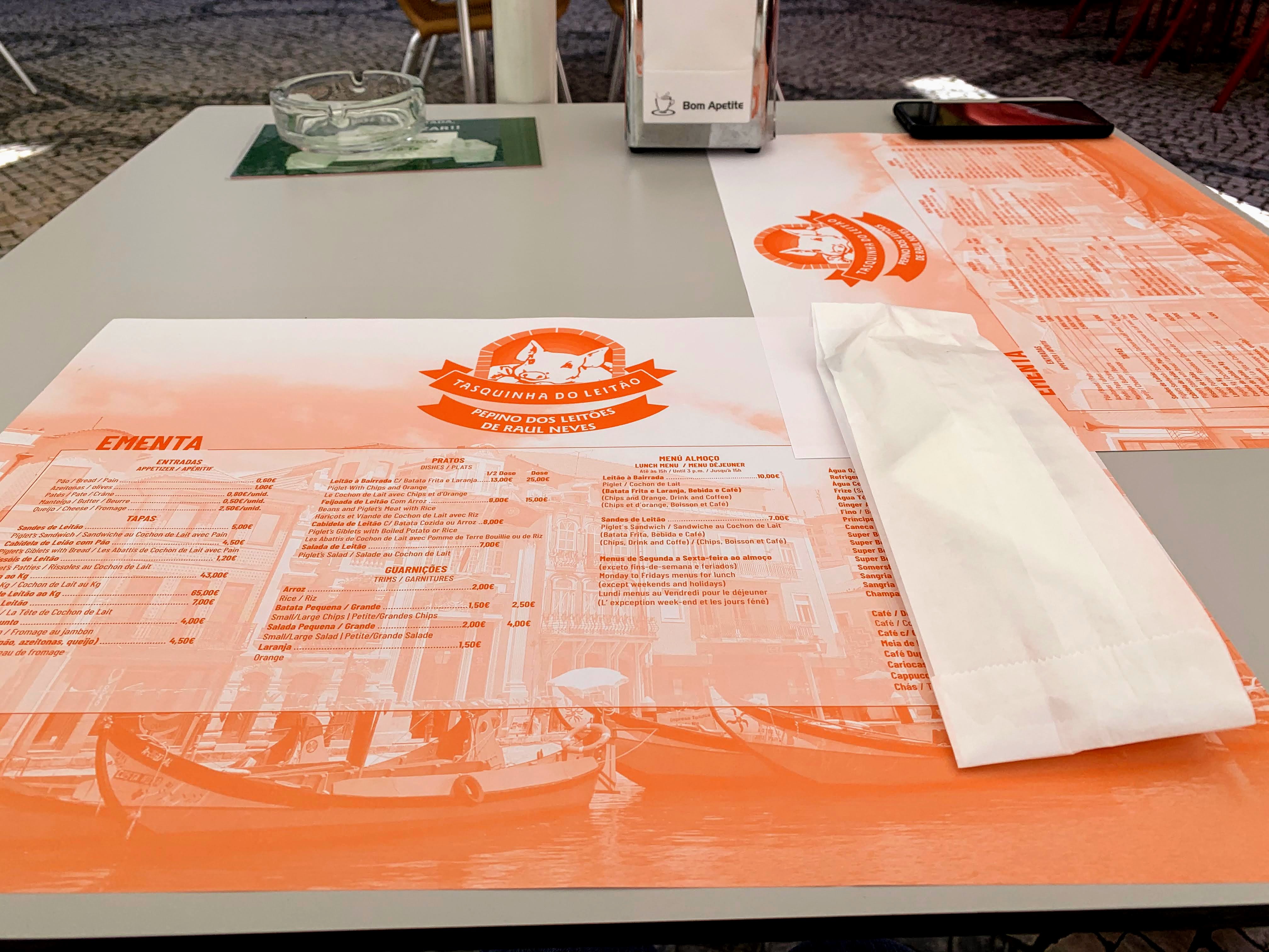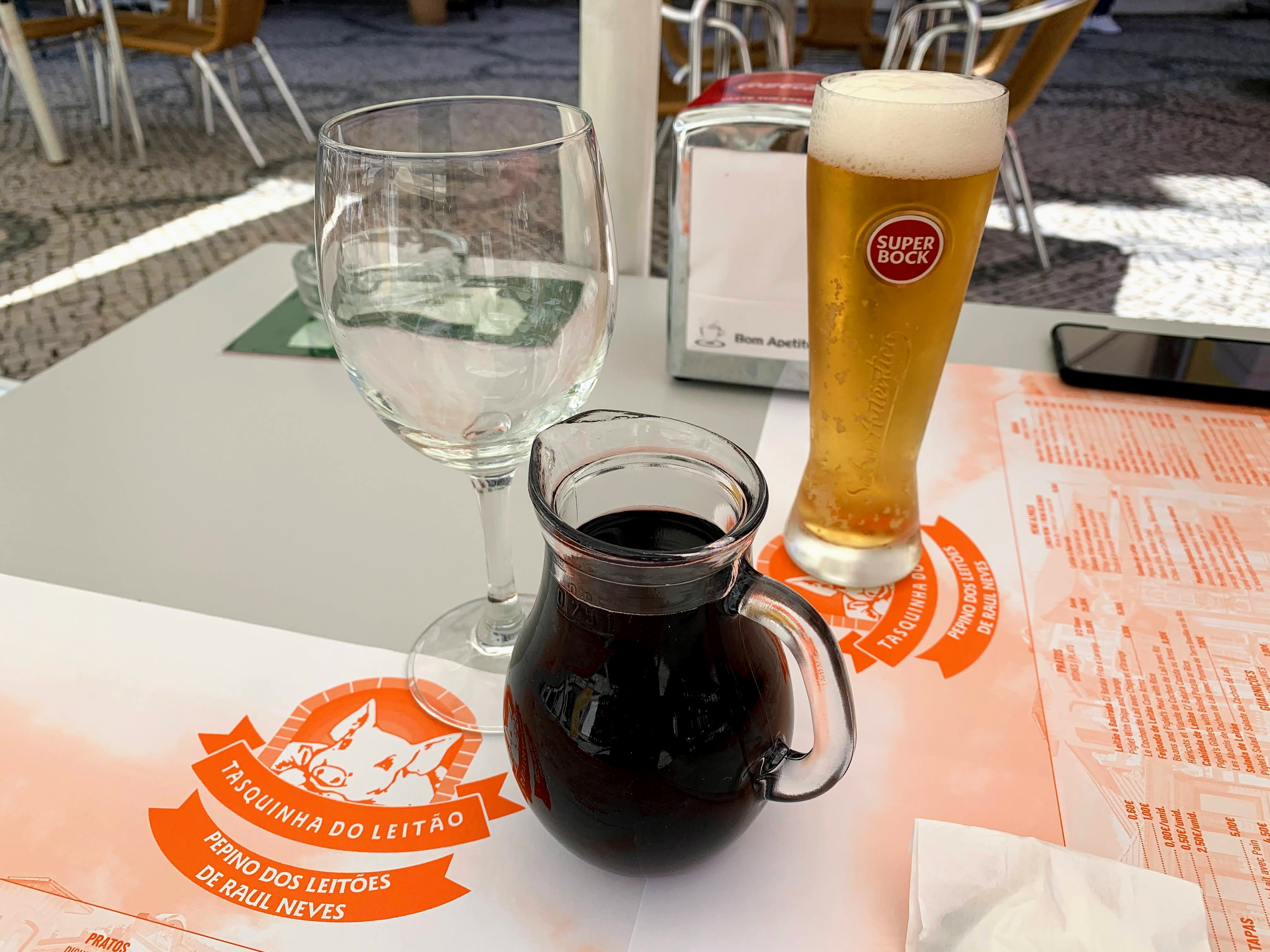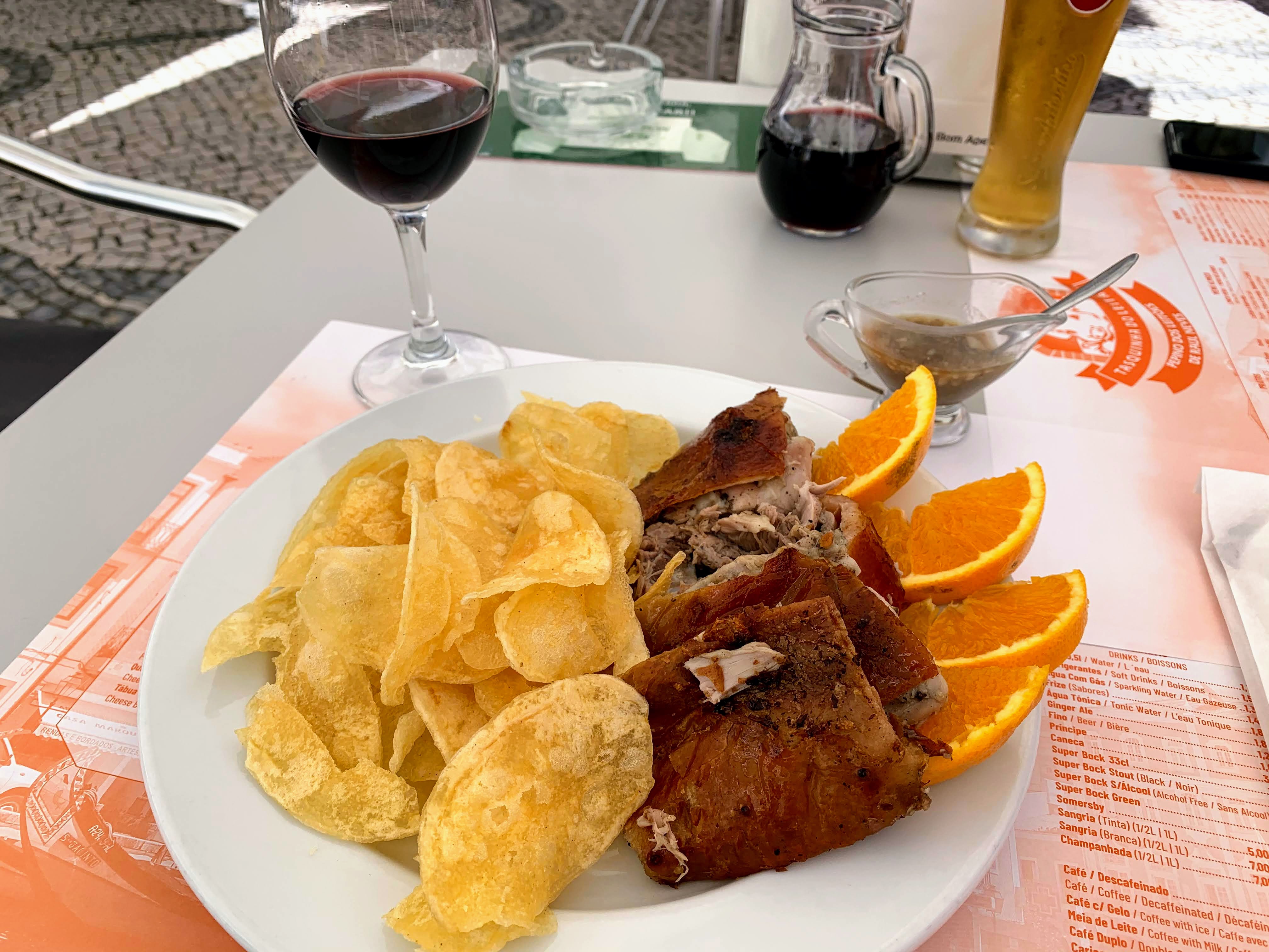 Leitão à Bairrada, grilled piglet from the region with potato chips & orange, Menu Almoço (lunch set) Including drink & cafe (10€), I chose red wine and it comes in a small pitcher of 250ml. I love it.Leitão sandwich with potato chips, as Menu Almoço (7€), he chose ‘Fino,’ 250ml of draft beer. Leitão was very juicy and good for both itself or sandwich 🙂
