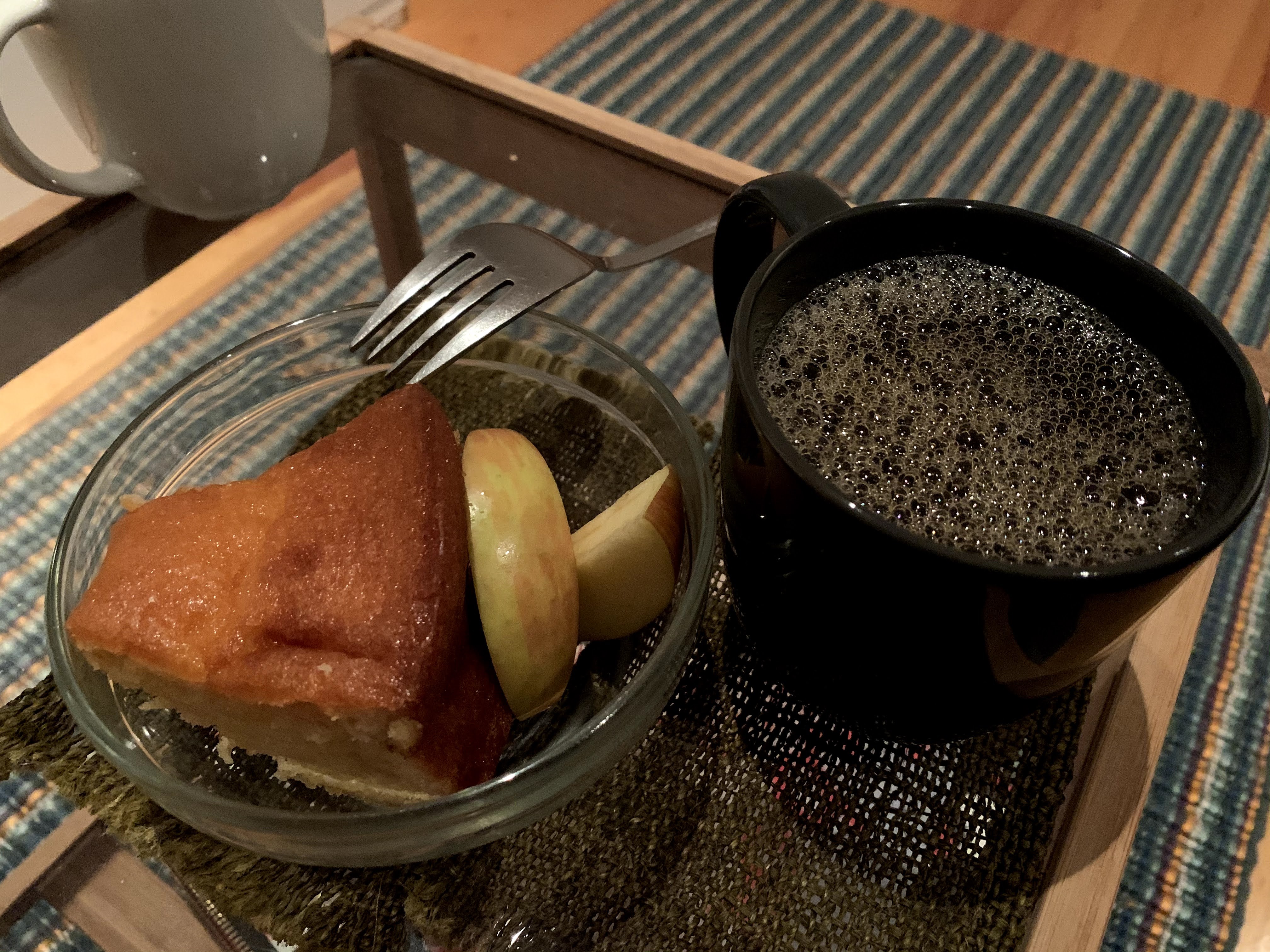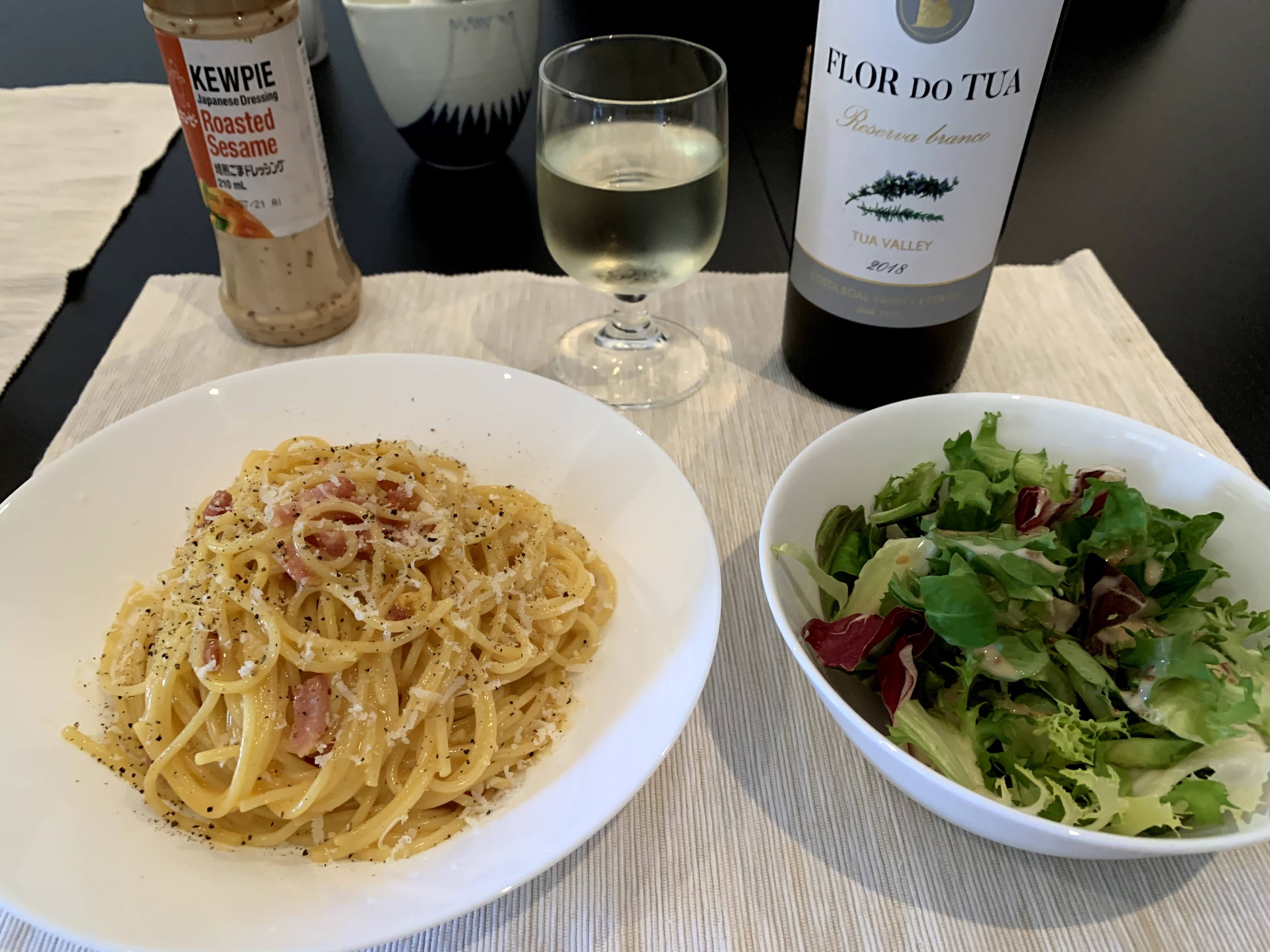 Breakfast: Orange cake (Bolo de laranja), apple, coffee @ 7:00 a.m.Second breakfast for him: Leftover, Bacalhau croquette & tomato rice @ 9:30 a.m.This is actually for me…plus white wine and cheeseChocolate & coffee @ 11:15 a.m.Lunch: Carbonara, green salad, white wine @ 1:15 p.m.