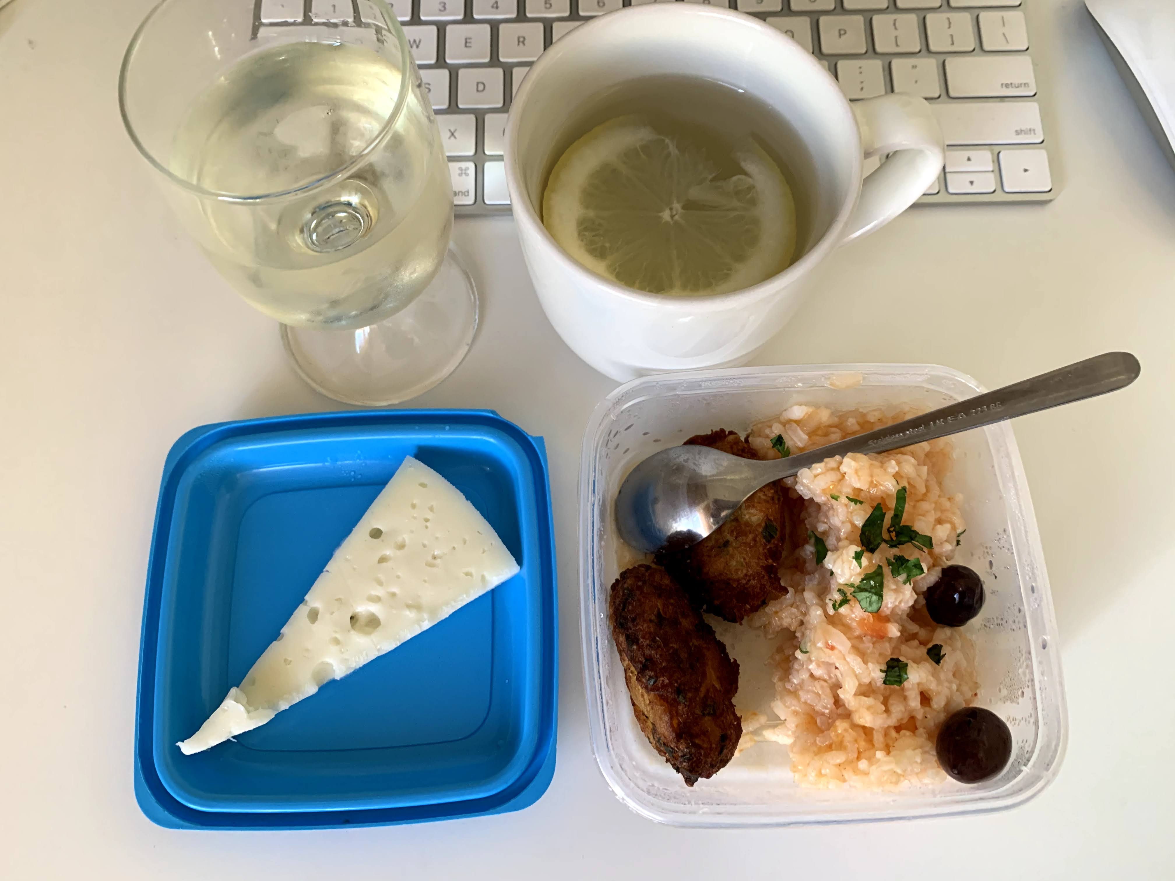 Breakfast: French Toast with pistachio cream @ 7:15 a.m.Lunch: Leftover chicken & rice @ 12:45 p.m.Chicken was not enough. Had bread, sardine pate, cheese with tomato jam + white wine (verdelho)